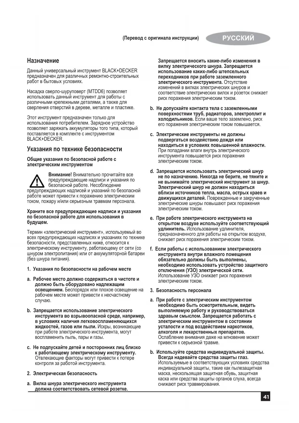 Данный универсальный инструмент BLACK+DECKER предназначен для различных ремонтно-строительных работ в бытовых условиях. Насадка сверло-шуруповерт (MTDD6) позволяет использовать данный инструмент для работы с различными крепежными деталями, а также для сверления отверстий в дереве, металле и пластике. Этот инструмент предназначен только для использования потребителем. Зарядное устройство позволяет заряжать аккумуляторы того типа, который поставляется в комплекте с инструментом BLACK+DECKER. Указания по технике безопасности Общие указания по безопасной работе с электрическим инструментом Внимание! Внимательно прочитайте все предупреждающие надписи и указания по безопасной работе. Несоблюдение предупреждающих надписей и указаний по безопасной работе может привести к поражению электрическим током, пожару и/или серьезным травмам персонала. Храните все предупреждающие надписи и указания по безопасной работе для использования в