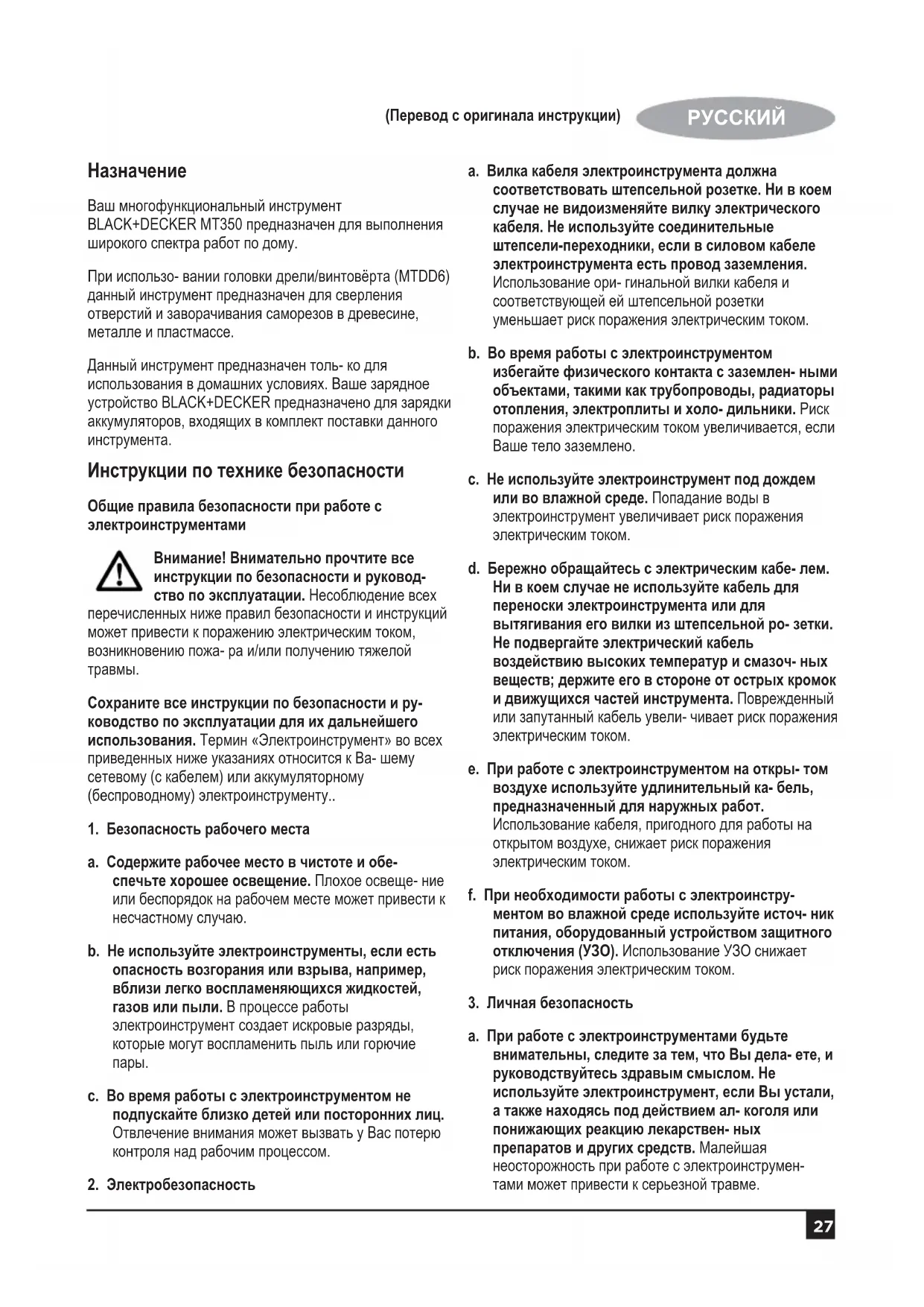 Ваш многофункциональный инструмент BLACK+DECKER MT350 предназначен для выполнения широкого спектра работ по дому. При использо- вании головки дрели/винтовёрта (MTDD6) данный инструмент предназначен для сверления отверстий и заворачивания саморезов в древесине, металле и пластмассе. Данный инструмент предназначен толь- ко для использования в домашних условиях. Ваше зарядное устройство BLACK+DECKER предназначено для зарядки аккумуляторов, входящих в комплект поставки данного инструмента. Инструкции по технике безопасности Общие правила безопасности при работе с электроинструментами Внимание! Внимательно прочтите все инструкции по безопасности и руковод- ство по эксплуатации. Несоблюдение всех перечисленных ниже правил безопасности и инструкций может привести к поражению электрическим током, возникновению пожа- ра и/или получению тяжелой