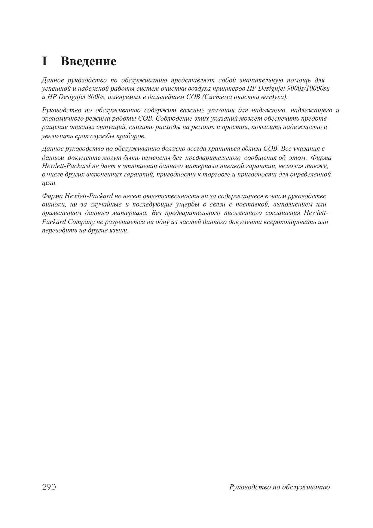 60 kg 95 kg 56 dB(A) 63 dB(A) Filtr třídy F 5 Filtr třídy F 5 16 kg 2 x 16 kg289 HP Designjet 9000s/10000s Система очистки воздуха HP Designjet 8000s Система очистки воздуха User´s GGuide290 Руководство по обслуживанию I Введение Данное руководство по обслуживанию представляет собой значительную помощь для успешной и надежной работы систем очистки воздуха принтеров HP Designjet 9000s/10000sи и HP Designjet 8000s, именуемых в дальнейшем СОВ (Система очистки воздуха). Руководство по обслуживанию содержит важные указания для надежного, надлежащего и экономичного режима работы СОВ. Соблюдение этих указаний может обеспечить предотв- ращение опасных ситуаций, снизить расходы на ремонт и простои, повысить надежность и увеличить срок службы приборов. Данное руководство по обслуживанию должно всегда храниться вблизи СОВ. Все указания в данном документе могут быть изменены без предварительного сообщения об этом. Фирма Hewlett-Packard не дает в отношении данного материала никакой гарантии, включая также, в числе других включенных гарантий, пригодности к торговле и пригодности для определенной