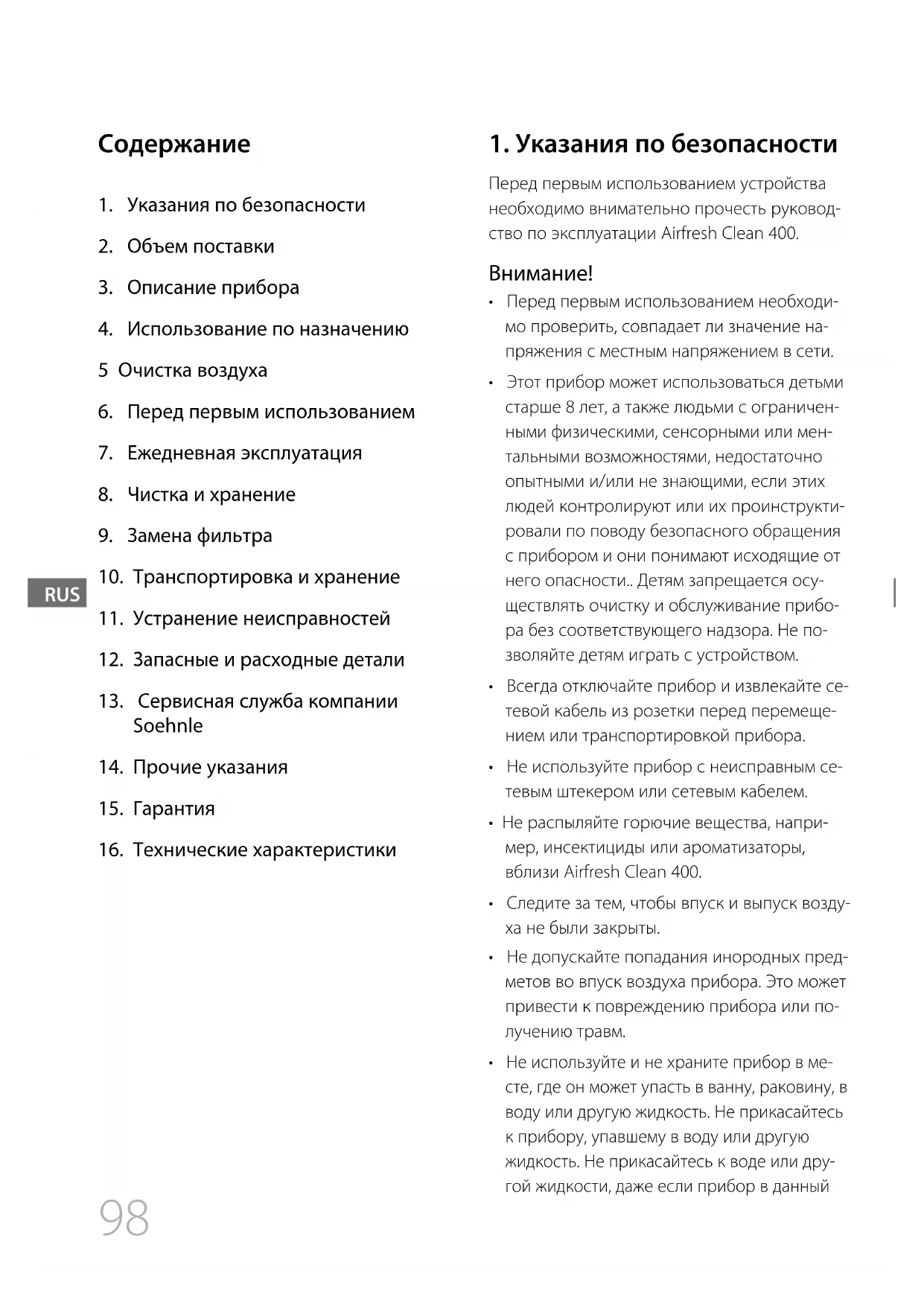 РУКОВОДСТВО ПОЛЬЗОВАТЕЛЯ Airfresh Clean 400 SOEHNLE