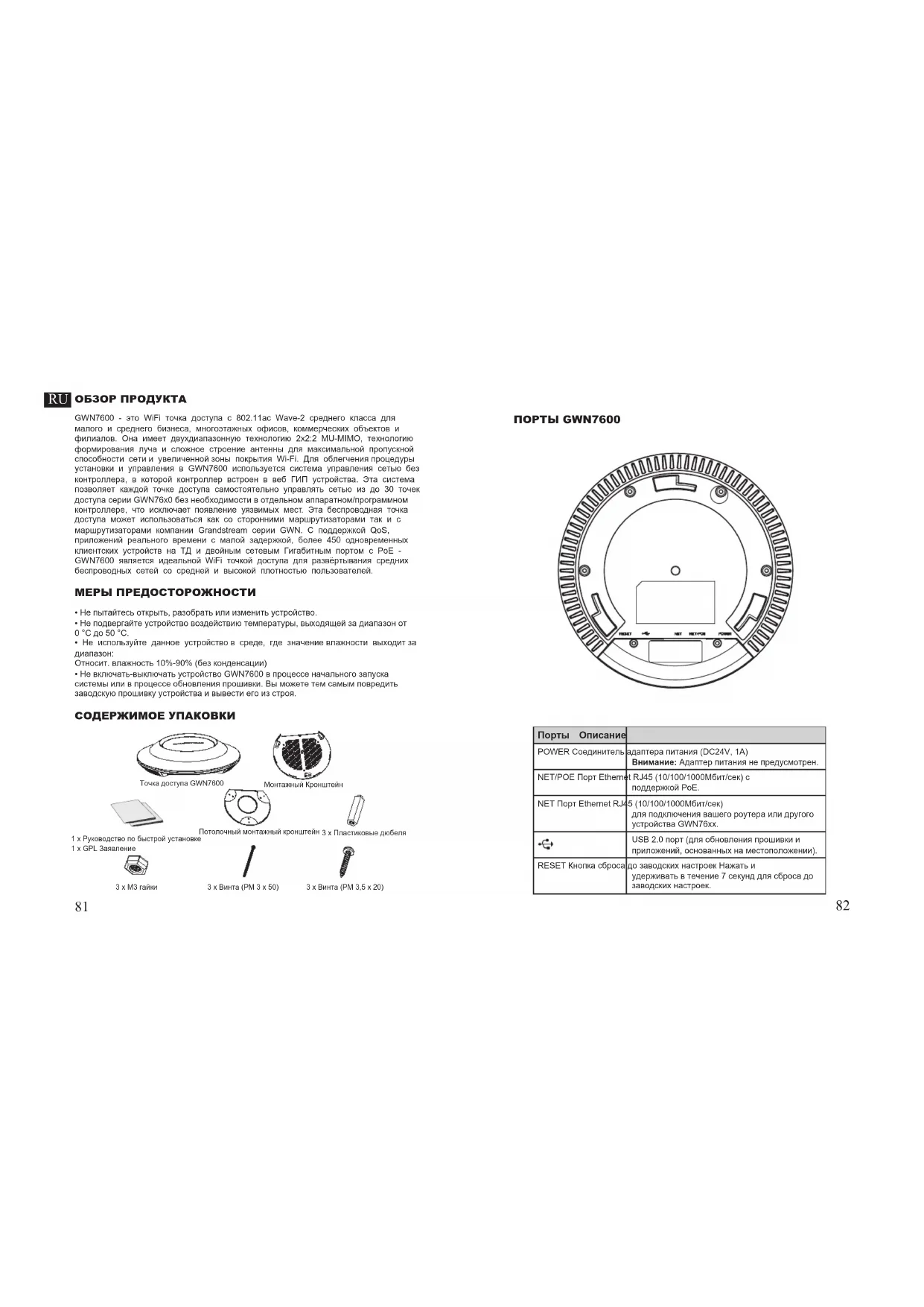 ção do GWN7600, ou coloque manualmente no navegador o endereço IP exibido.ОБЗОР ПРОДУКТА GWN7600 - это WiFi точка доступа с 802.11ac Wave-2 среднего класса для малого и среднего бизнеса, многоэтажных офисов, коммерческих объектов и филиалов. Она имеет двухдиапазонную технологию 2x2:2 MU-MIMO, технологию формирования луча и сложное строение антенны для максимальной пропускной способности сети и увеличенной зоны покрытия Wi-Fi. Для облегчения процедуры установки и управления в GWN7600 используется система управления сетью без контроллера, в которой контроллер встроен в веб ГИП устройства. Эта система позволяет каждой точке доступа самостоятельно управлять сетью из до 30 точек доступа серии GWN76х0 без необходимости в отдельном аппаратном/программном контроллере, что исключает появление уязвимых мест. Эта беспроводная точка доступа может использоваться как со сторонними маршрутизаторами так и с маршрутизаторами компании Grandstream серии GWN. С поддержкой QoS, приложений реального времени с малой задержкой, более 450 одновременных клиентских устройств на ТД и двойным сетевым Гигабитным портом с PoE - GWN7600 является идеальной WiFi точкой доступа для развёртывания средних беспроводных сетей со средней и высокой плотностью пользователей. МЕРЫ ПРЕДОСТОРОЖНОСТИ