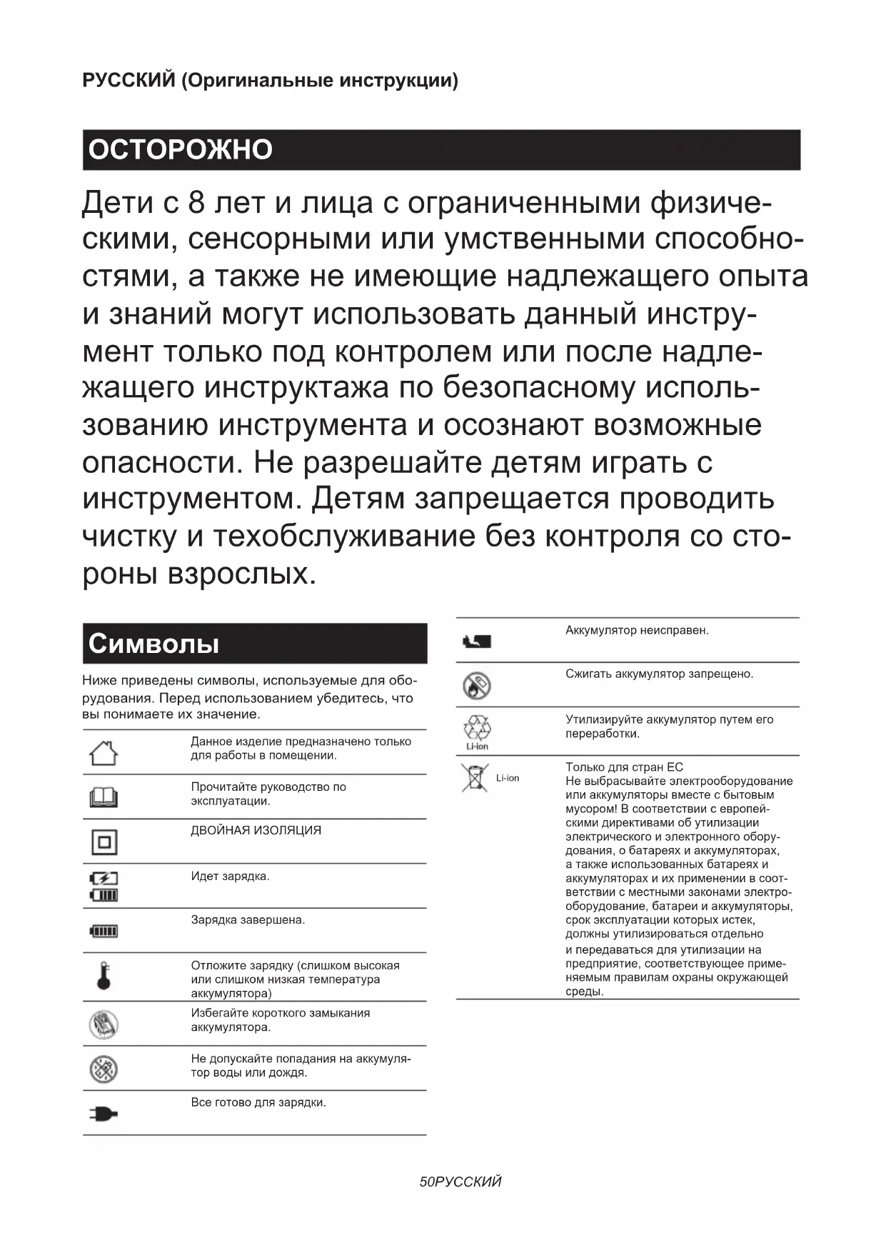 Ниже приведены символы, используемые для обо- рудования. Перед использованием убедитесь, что вы понимаете их значение. Данное изделие предназначено только для работы в помещении. Прочитайте руководство по эксплуатации. ДВОЙНАЯ ИЗОЛЯЦИЯ Идет зарядка. Зарядка завершена. Отложите зарядку (слишком высокая или слишком низкая температура аккумулятора) Избегайте короткого замыкания аккумулятора. Не допускайте попадания на аккумуля- тор воды или дождя. Все готово для зарядки. Аккумулятор неисправен. Сжигать аккумулятор запрещено. Утилизируйте аккумулятор путем его переработки. Li-ion Только для стран ЕС Не выбрасывайте электрооборудование или аккумуляторы вместе с бытовым мусором! В соответствии с европей- скими директивами об утилизации электрического и электронного обору- дования, о батареях и аккумуляторах, а также использованных батареях и аккумуляторах и их применении в соот- ветствии с местными законами электро- оборудование, батареи и аккумуляторы, срок эксплуатации которых истек, должны утилизироваться отдельно и передаваться для утилизации на предприятие, соответствующее приме- няемым правилам охраны окружающей среды.51 РУССКИЙ