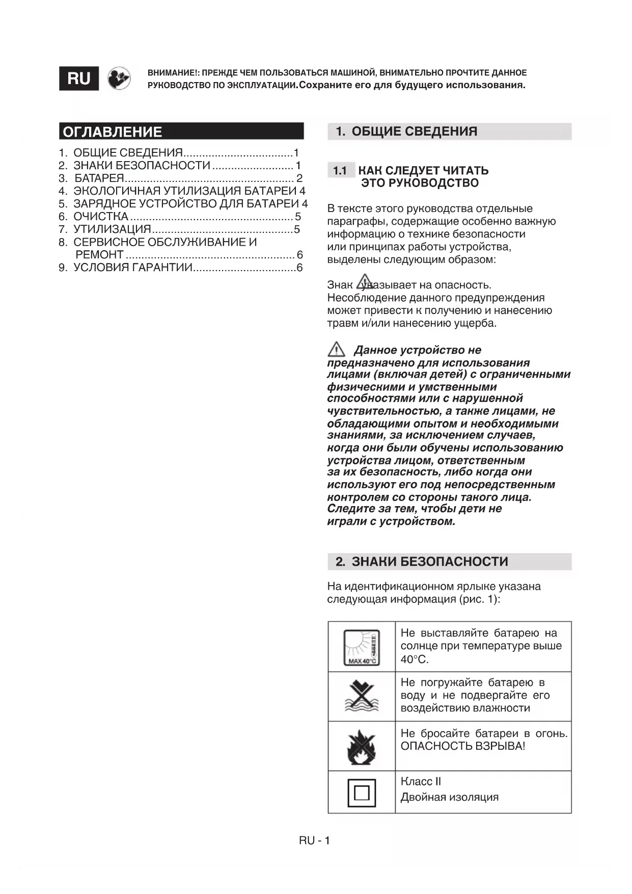 Не выставляйте батарею на солнце при температуре выше 40°C. Не погружайте батарею в воду и не подвергайте его воздействию влажности Не бросайте батареи в огонь. ОПАСНОСТЬ ВЗРЫВА! Класс II Двойная изоляция ВНИМАНИЕ!: ПРЕЖДЕ ЧЕМ ПОЛЬЗОВАТЬСЯ МАШИНОЙ, ВНИМАТЕЛЬНО ПРОЧТИТЕ ДАННОЕ РУКОВОДСТВО ПО ЭКСПЛУАТАЦИИ. Сохраните его для будущего использования.