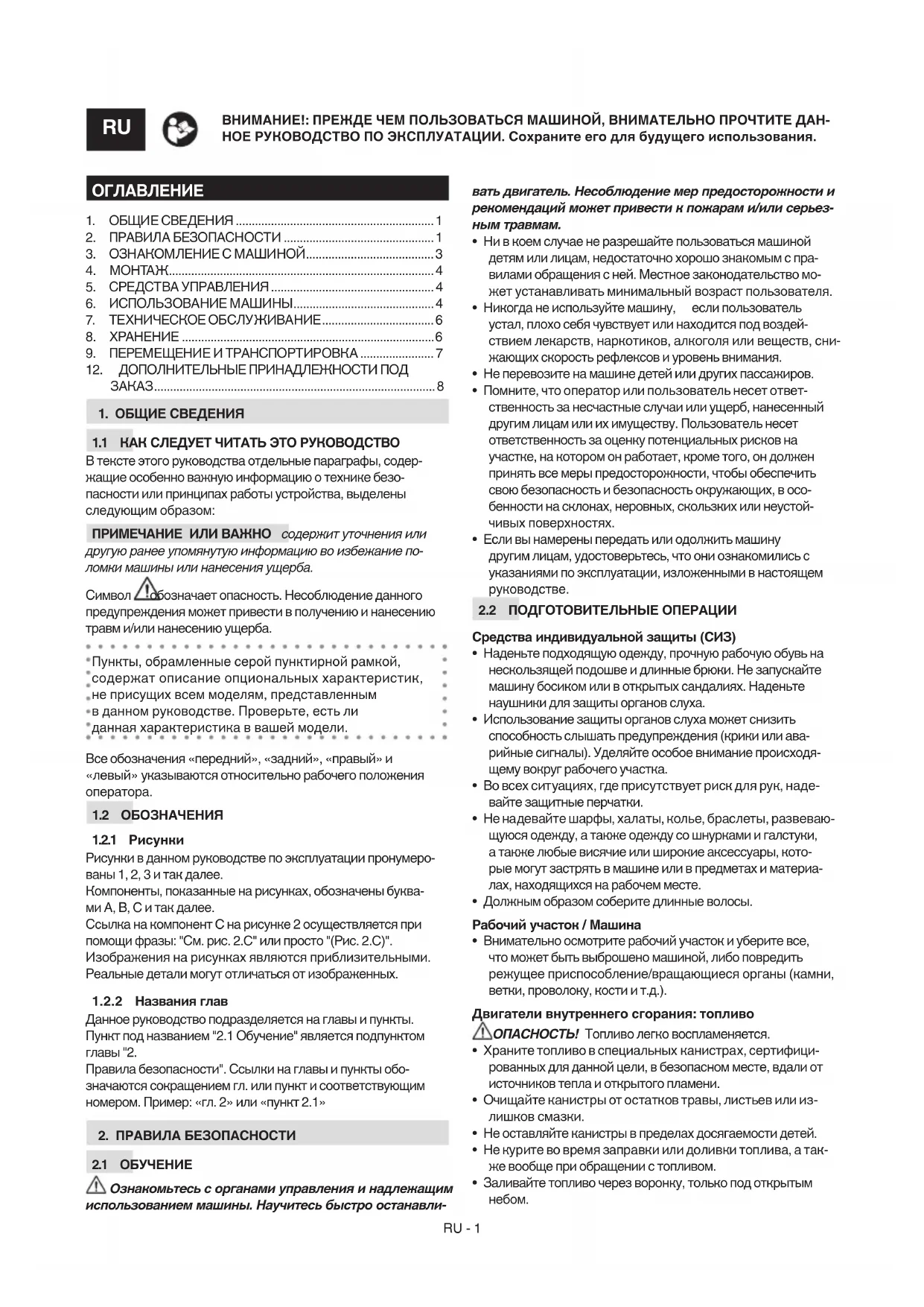 Ознакомьтесь с органами управления и надлежащим использованием машины. Научитесь быстро останавли- вать двигатель. Несоблюдение мер предосторожности и рекомендаций может привести к пожарам и/или серьез- ным травмам.