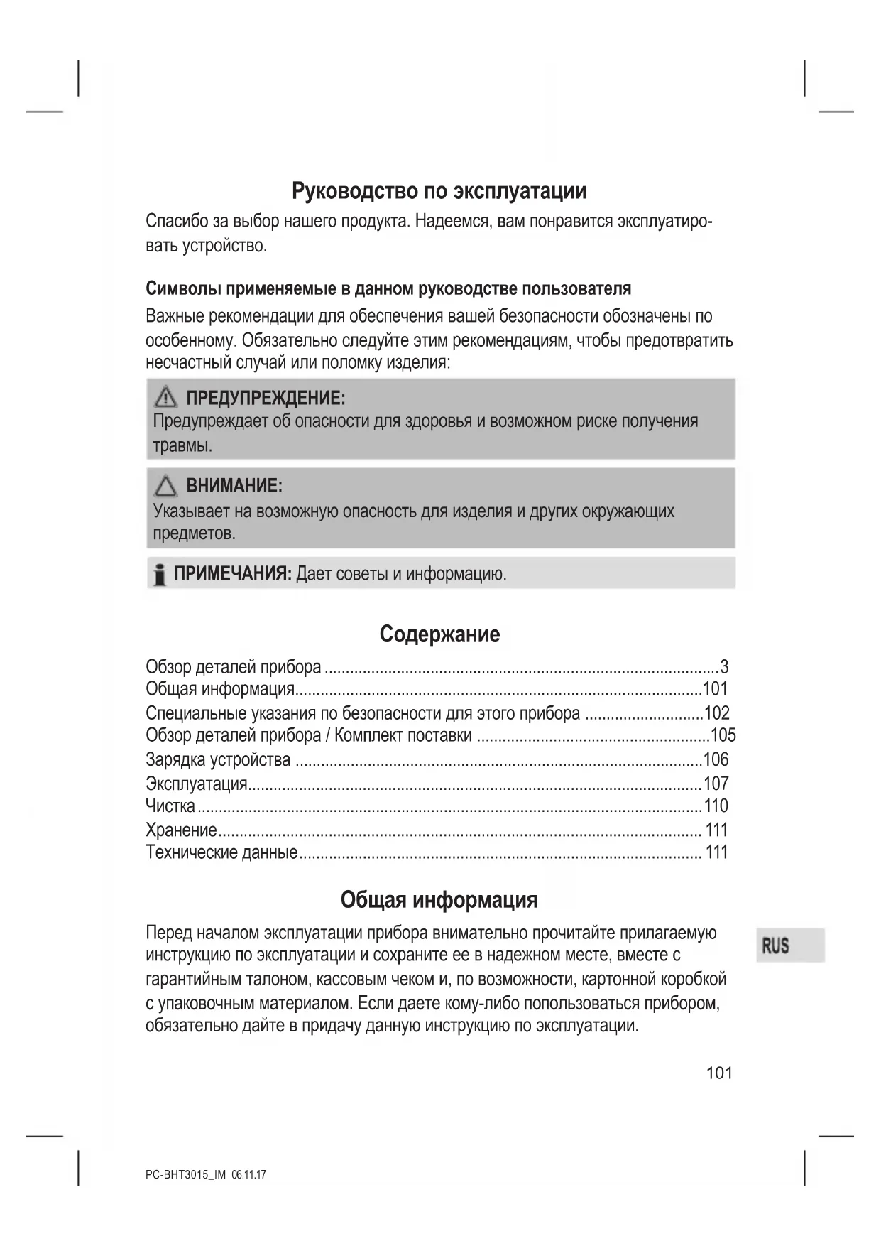 - Технические данные Общая информация Перед началом эксплуатации прибора внимательно прочитайте прилагаемую инструкцию по эксплуатации и сохраните ее в надежном месте, вместе с гарантийным талоном, кассовым чеком и, по возможности, картонной коробкой с упаковочным материалом. Если даете кому-либо попользоваться прибором, обязательно дайте в придачу данную инструкцию по эксплуатации.PC-BHT3015_IM 06.11.17 p. 111
