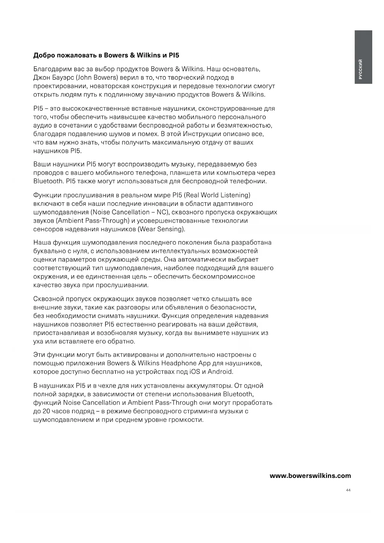 www.bowerswilkins.com Добро пожаловать в Bowers & Wilkins и PI5 Благодарим вас за выбор продуктов Bowers & Wilkins. Наш основатель, Джон Бауэрс (John Bowers) верил в то, что творческий подход в проектировании, новаторская конструкция и передовые технологии смогут открыть людям путь к подлинному звучанию продуктов Bowers & Wilkins. PI5 – это высококачественные вставные наушники, сконструированные для того, чтобы обеспечить наивысшее качество мобильного персонального аудио в сочетании с удобствами беспроводной работы и безмятежностью, благодаря подавлению шумов и помех. В этой Инструкции описано все, что вам нужно знать, чтобы получить максимальную отдачу от ваших наушниковPI5. Ваши наушники PI5 могут воспроизводить музыку, передаваемую без проводов с вашего мобильного телефона, планшета или компьютера через Bluetooth. PI5 также могут использоваться для беспроводной телефонии. Функции прослушивания в реальном мире PI5 (Real World Listening) включают в себя наши последние инновации в области адаптивного шумоподавления (Noise Cancellation – NC), сквозного пропуска окружающих звуков (Ambient Pass-Through) и усовершенствованные технологии сенсоров надевания наушников (Wear Sensing). Наша функция шумоподавления последнего поколения была разработана буквально с нуля, с использованием интеллектуальных возможностей оценки параметров окружающей среды. Она автоматически выбирает соответствующий тип шумоподавления, наиболее подходящий для вашего окружения, и ее единственная цель – обеспечить бескомпромиссное качество звука при прослушивании. Сквозной пропуск окружающих звуков позволяет четко слышать все внешние звуки, такие как разговоры или объявления о безопасности, без необходимости снимать наушники. Функция определения надевания наушников позволяет PI5 естественно реагировать на ваши действия, приостанавливая и возобновляя музыку, когда вы вынимаете наушник из уха или вставляете его обратно. Эти функции могут быть активированы и дополнительно настроены с помощью приложения Bowers & Wilkins Headphone App для наушников, которое доступно бесплатно на устройствах под iOS и Android. В наушниках PI5 и в чехле для них установлены аккумуляторы. От одной полной зарядки, в зависимости от степени использования Bluetooth, функций Noise Cancellation и Ambient Pass-Through они могут проработать до 20 часов подряд – в режиме беспроводного стриминга музыки с шумоподавлением и при среднем уровне громкости.
