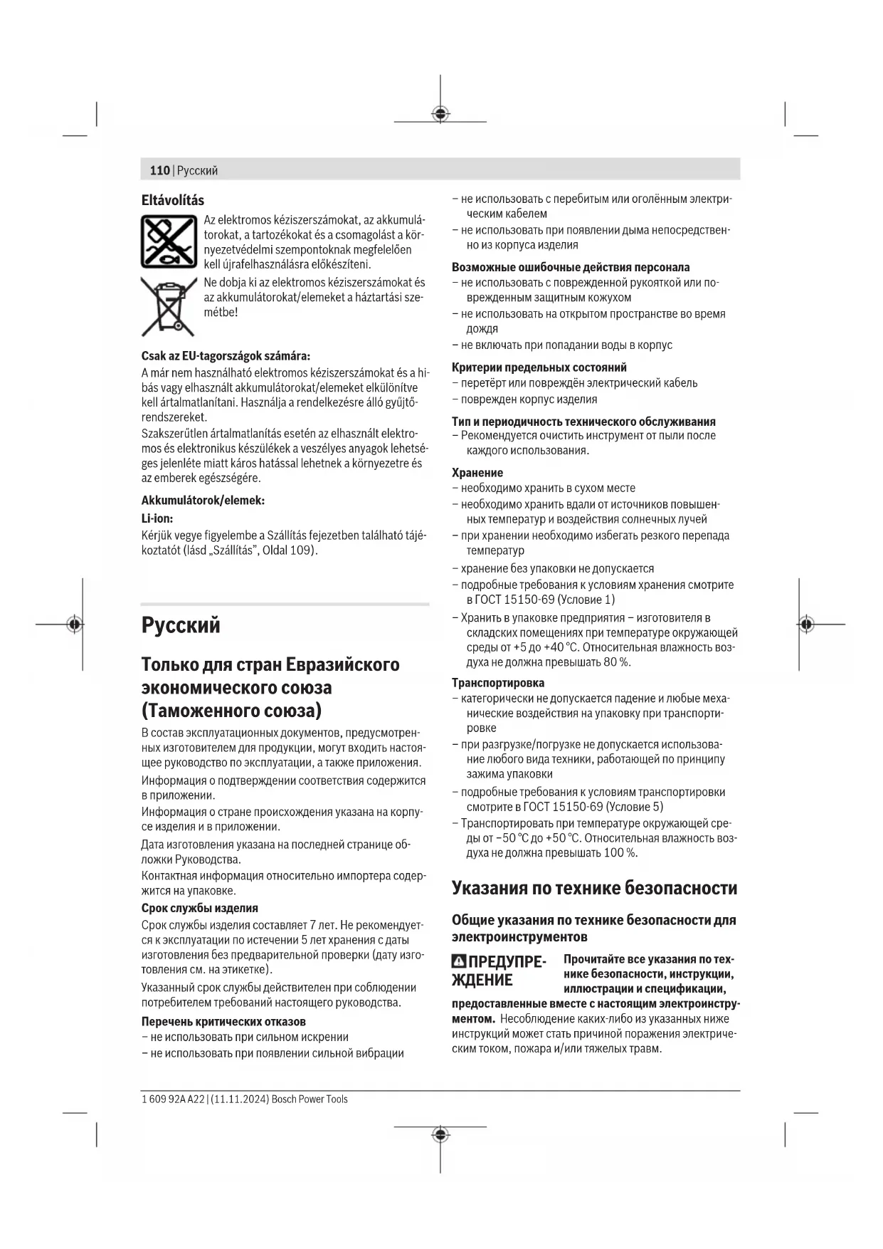 Уполномоченная изготовителем организация: ООО «Роберт Бош» Вашутинское шоссе, вл. 24 141400, г. Химки, Московская обл. Тел.: +7 800 100 8007 E-Mail: info.powertools@ru.bosch.com www.bosch-pt.ru Прочие сервисные адреса находятся на: www.bosch-pt.com/serviceaddresses Bosch Power Tools 1 609 92A A22 | (11.11.2024)118 | Українська В случае выхода электроинструмента из строя в течение гарантийного срока эксплуатации по вине изготовителя, владелец имеет право на бесплатный гарантийный ре- монт, при соблюдении следующих условий: – отсутствие механических повреждений; – отсутствие признаков нарушения требований руко- водства по эксплуатации – наличие в руководстве по эксплуатации отметки про- давца о продаже и подписи покупателя; – соответствие серийного номера электроинструмента и серийному номеру в гарантийном талоне; – отсутствие следов неквалифицированного ремонта. Гарантия не распространяется на: – любые поломки, связанные с форс-мажорными обсто- ятельствами; – нормальный износ: электроинструмента, так же, как и все электрические. Гарантией не покрывается ремонт, потребность в кото- ром возникает вследствие нормального износа, сокра- щающего срок службы таких частей инструмента, как присоединительные контакты, провода, щётки и т.п.: – естественный износ (полная выработка ресурса); – оборудование и его части, выход из строя которых стал следствием неправильной установки, несанкцио- нированной модификации, неправильного примене- ния, нарушение правил обслуживания или хранения; – неисправности, возникшие в результате перегрузки электроинструмента. (К безусловным признакам пере- грузки инструмента относятся: появление цвета побе- жалости, деформация или оплавление деталей и узлов электроинструмента, потемнение или обугливание изоляции проводов электродвигателя под действием высокой температуры.) Транспортировка На вложенные литий-ионные аккумуляторные батареи распространяются требования в отношении транспорти- ровки опасных грузов. Аккумуляторные батареи могут перевозиться самим пользователем автомобильным транспортом без необходимости соблюдения дополни- тельных норм. При пересылке третьими лицами (напр.: самолетом или транспортным экспедитором) необходимо соблюдать особые требования к упаковке и маркировке. В этом слу- чае при подготовке груза к отправке необходимо участие эксперта по опасным грузам. Пересылайте аккумуляторную батарею только в том слу- чае, если корпус не поврежден. Заклейте открытые кон- такты и упакуйте аккумуляторную батарею так, чтобы она не болталась в упаковке. Соблюдайте, пожалуйста, также возможные дополнительные национальные предписа-