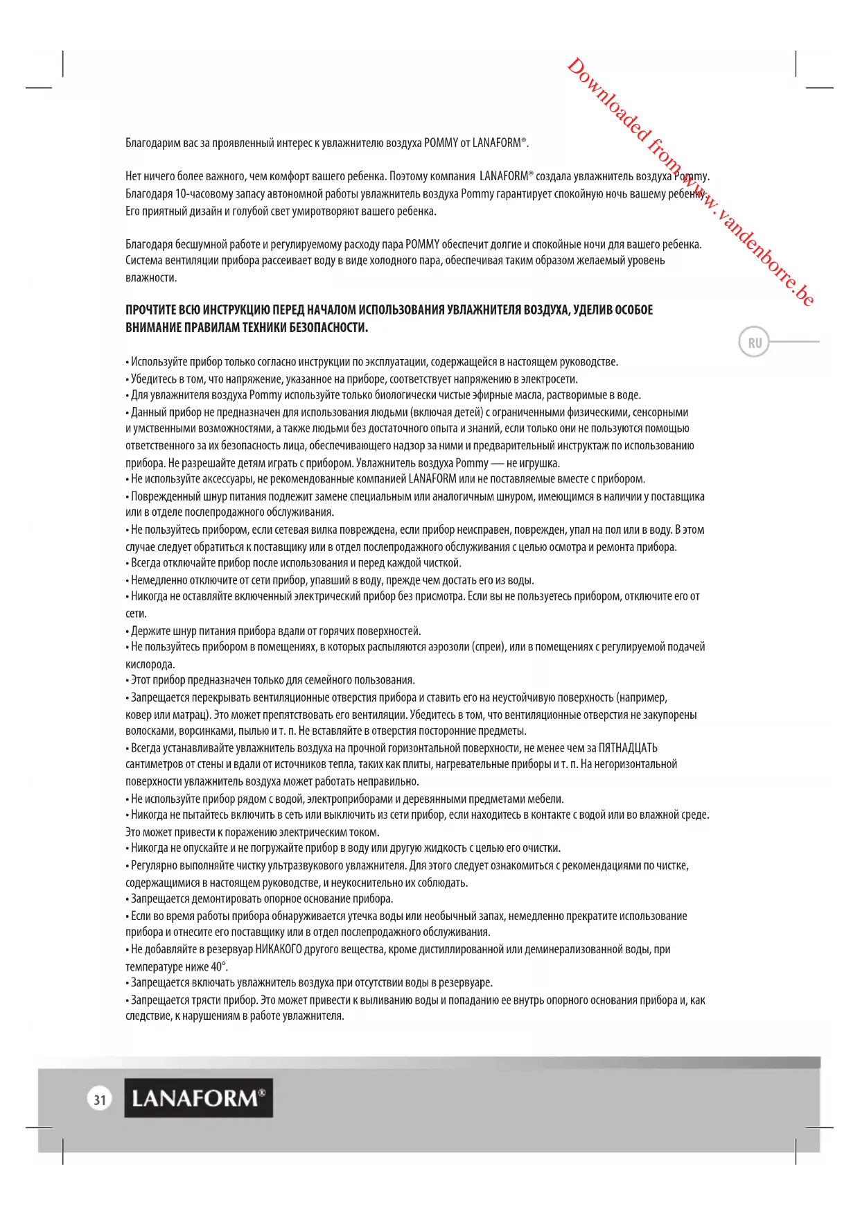 Downloaded from www.vandenborre.be31 Благодарим вас за проявленный интерес к увлажнителю воздуха POMMY от LANAFORM®. Нет ничего более важного, чем комфорт вашего ребенка. Поэтому компания LANAFORM® создала увлажнитель воздуха Pommy. Благодаря 10-часовому запасу автономной работы увлажнитель воздуха Pommy гарантирует спокойную ночь вашему ребенку. Его приятный дизайн и голубой свет умиротворяют вашего ребенка. Благодаря бесшумной работе и регулируемому расходу пара POMMY обеспечит долгие и спокойные ночи для вашего ребенка. Система вентиляции прибора рассеивает воду в виде холодного пара, обеспечивая таким образом желаемый уровень