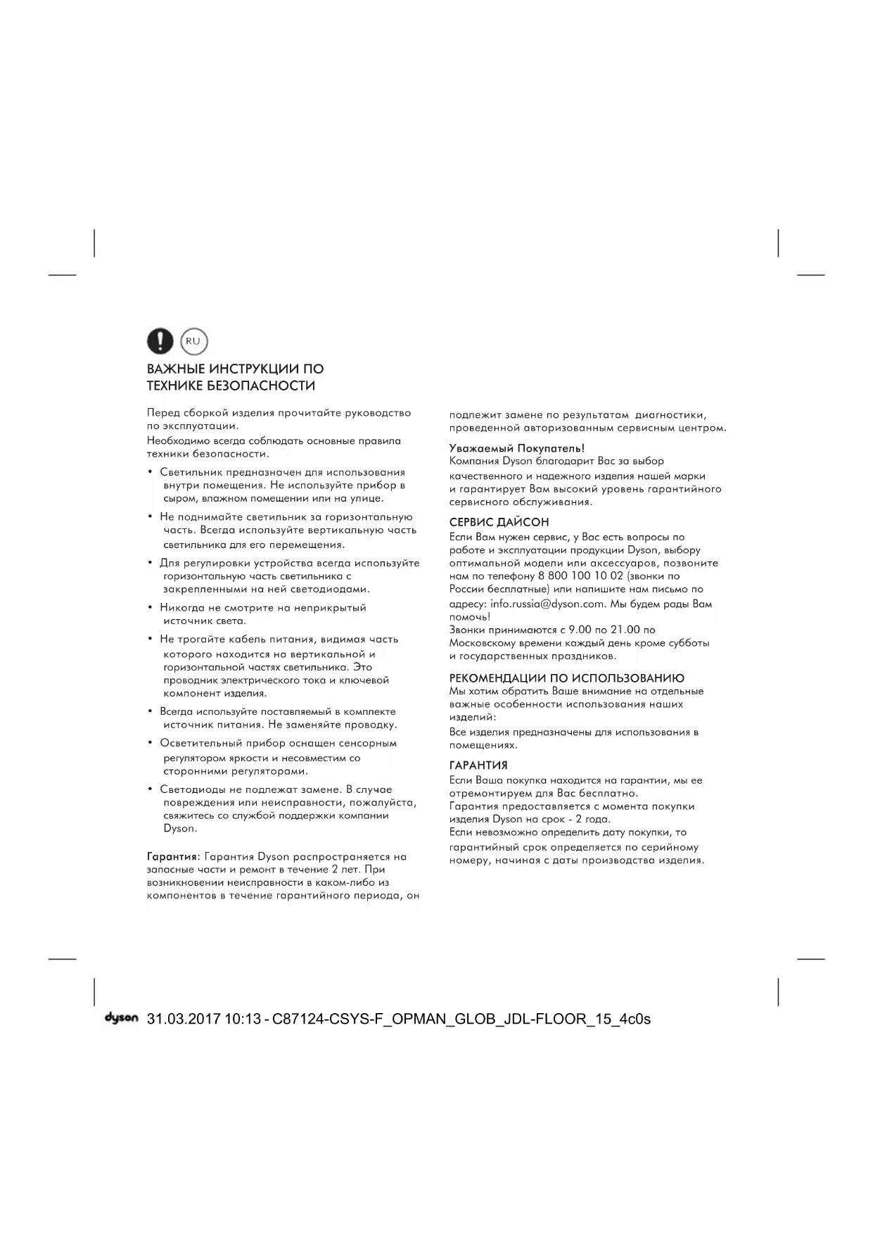 - Иные неполадки, вызванные обстоятельствами, на которые Dyson не может влиять. СРОК СЛУЖБЫ Срок службы осветительных приборов Dyson индивидуального назначения составляет 10(десять) лет с момента покупки. ЗАРЕГИСТРИРУТЕ СВОЮ ГАРАНТИЮ Для того, чтобы мы смогли оказать Вам помощь своевременно и эффективно, зарегистрируйте, пожалуйста, свою гарантию. Вы можете зарегистрировать гарантию, позвонив нам по телефону 8800100 10 02 или написав нам письмо по адресу: info.russia@dyson.com