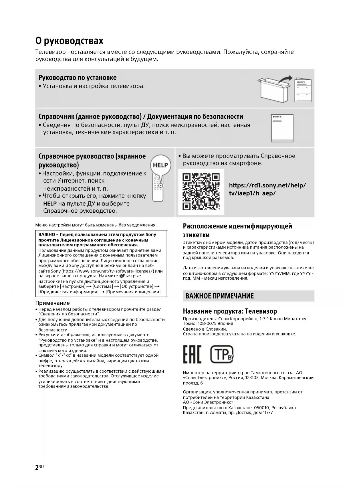 - Вы можете просматривать Справочное руководство на смартфоне. https://rd1.sony.net/help/ tv/iaep1/h_aep/ ВАЖНО – Перед пользованием этим продуктом Sony прочтите Лицензионное соглашение с конечным пользователем программного обеспечения. Пользование данным продуктом означает принятие вами Лицензионного соглашения с конечным пользователем программного обеспечения. Лицензионное соглашение между вами и Sony доступно в режиме онлайн на веб- сайте Sony (https://www.sony.net/tv-software-licenses/) или на экране вашего продукта. Нажмите (Быстрые настройки) на пульте дистанционного управления и выберите [Настройки] [Система] [Об устройстве] [Юридическая информация] [Примечания и лицензии]. ВАЖНОЕ ПРИМЕЧАНИЕ3
