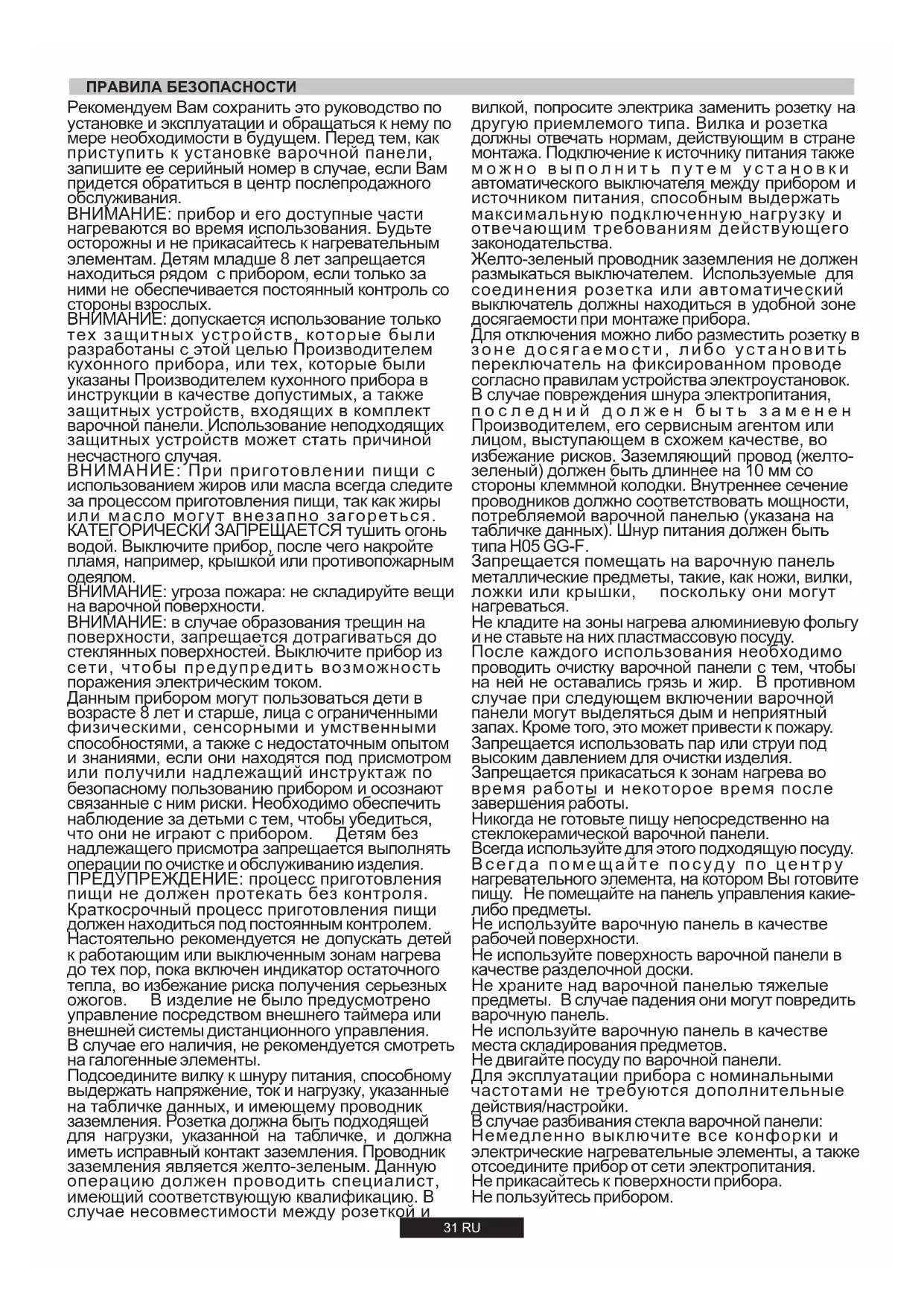 ВНИМАНИЕ: в случае образования трещин на поверхности, запрещается дотрагиваться до стеклянных поверхностей. Выключите прибор из сети, чтобы предупредить возможность поражения электрическим током. Рекомендуем Вам сохранить это руководство по установке и эксплуатации и обращаться к нему по мере необходимости в будущем. Перед тем, как приступить к установке варочной панели, запишите ее серийный номер в случае, если Вам придется обратиться в центр послепродажного обслуживания. Данным прибором могут пользоваться дети в возрасте 8 лет и старше, лица с ограниченными физическими, сенсорными и умственными способностями, а также с недостаточным опытом и знаниями, если они находятся под присмотром или получили надлежащий инструктаж по безопасному пользованию прибором и осознают связанные с ним риски. Необходимо обеспечить наблюдение за детьми с тем, чтобы убедиться, что они не играют с прибором. Детям без надлежащего присмотра запрещается выполнять операции по очистке и обслуживанию изделия. Подсоедините вилку к шнуру питания, способному выдержать напряжение, ток и нагрузку, указанные на табличке данных, и имеющему проводник заземления. Розетка должна быть подходящей для нагрузки, указанной на табличке, и должна иметь исправный контакт заземления. Проводник заземления является желто-зеленым. Данную операцию должен проводить специалист, имеющий соответствующую квалификацию. В случае несовместимости между розеткой и ВНИМАНИЕ: угроза пожара: не складируйте вещи на варочной поверхности. ВНИМАНИЕ: прибор и его доступные части нагреваются во время использования. Будьте осторожны и не прикасайтесь к нагревательным элементам. Детям младше 8 лет запрещается находиться рядом с прибором, если только за ними не обеспечивается постоянный контроль со стороны взрослых. В случае его наличия, не рекомендуется смотреть на галогенные элементы. Настоятельно рекомендуется не допускать детей к работающим или выключенным зонам нагрева до тех пор, пока включен индикатор остаточного тепла, во избежание риска получения серьезных ожогов. В изделие не было предусмотрено управление посредством внешнего таймера или внешней системы дистанционного управления. ПРЕДУПРЕЖДЕНИЕ: процесс приготовления пищи не должен протекать без контроля. Краткосрочный процесс приготовления пищи должен находиться под постоянным контролем. ПРАВИЛА БЕЗОПАСНОСТИ Не прикасайтесь к поверхности прибора. Не кладите на зоны нагрева алюминиевую фольгу и не ставьте на них пластмассовую посуду. После каждого использования необходимо проводить очистку варочной панели с тем, чтобы на ней не оставались грязь и жир. В противном случае при следующем включении варочной панели могут выделяться дым и неприятный запах. Кроме того, это может привести к пожару. Никогда не готовьте пищу непосредственно на стеклокерамической варочной панели. В случае повреждения шнура электропитания, последний должен быть заменен Производителем, его сервисным агентом или лицом, выступающем в схожем качестве, во избежание рисков. Заземляющий провод (желто- зеленый) должен быть длиннее на 10 мм со стороны клеммной колодки. Внутреннее сечение проводников должно соответствовать мощности, потребляемой варочной панелью (указана на табличке данных). Шнур питания должен быть типа .H05 GG-F Не используйте в