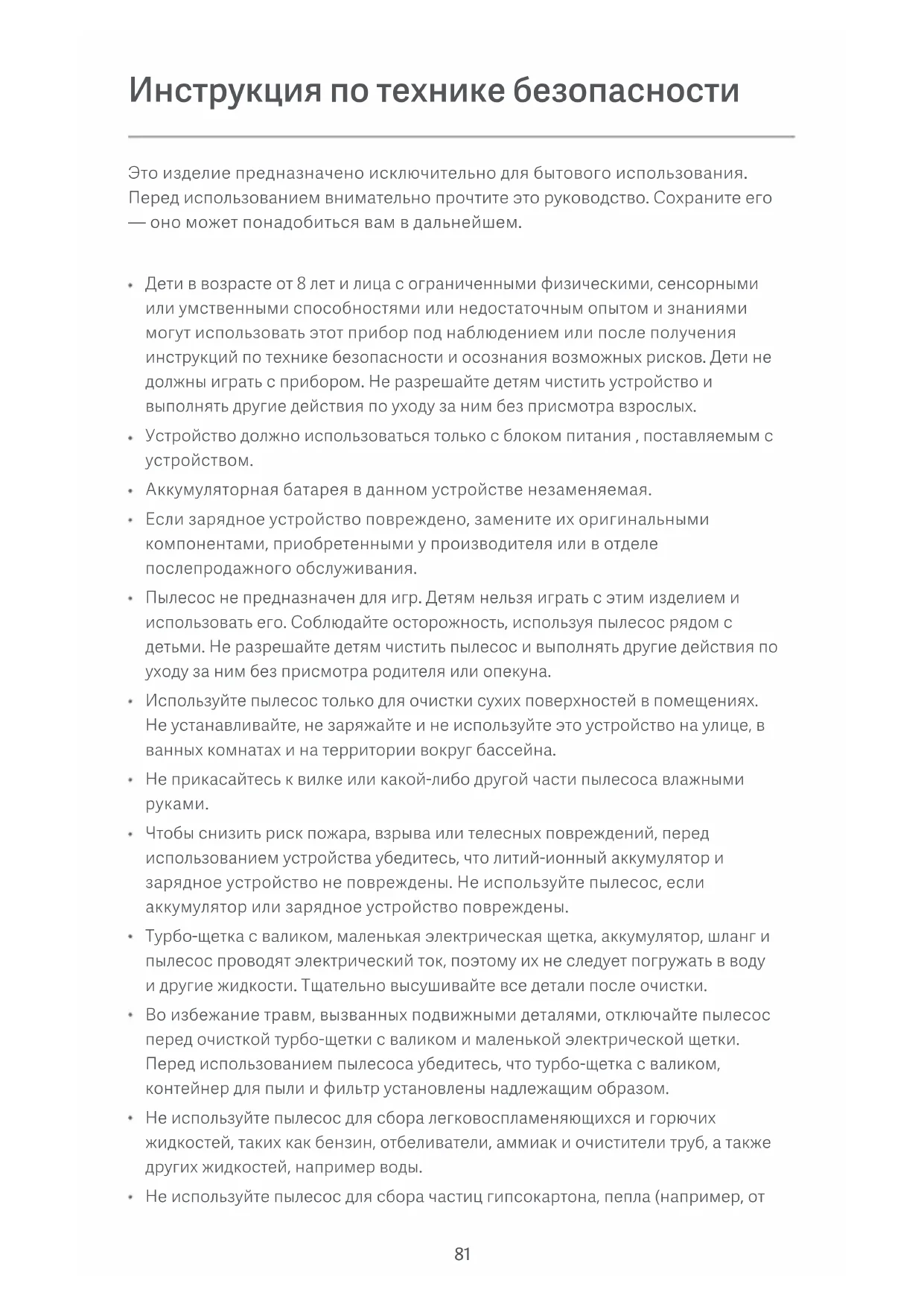 La aspiradora está en modo de espera y no puede utilizarse durante la carga. El pack de batería de ion de litio contiene sustancias que son perjudiciales para el medio ambiente. Antes de desechar la aspiradora, retire el pack de batería y deséchelo o recíclelo siguiendo las leyes y reglamentos locales del país o región en el que se use. Nota: La aspiradora debe apagarse antes de retirar la batería. La batería debe ser eliminada de manera segura.81 Инструкция по технике безопасности Это изделие предназначено исключительно для бытового использования. Перед использованием внимательно прочтите это руководство. Сохраните его — оно может понадобиться вам в дальнейшем. Дети в возрасте от 8лет и лица с ограниченными физическими, сенсорными или умственными способностями или недостаточным опытом и знаниями могут использовать этот прибор под наблюдением или после получения инструкций по технике безопасности и осознания возможных рисков. Дети не должны играть с прибором. Не разрешайте детям чистить устройство и выполнять другие действия по уходу за ним без присмотра взрослых. Устройство должно использоваться только с блоком питания , поставляемым с устройством. Аккумуляторная батарея в данном устройстве незаменяемая. Если зарядное устройство повреждено, замените их оригинальными компонентами, приобретенными у производителя или в отделе послепродажного обслуживания. Пылесос не предназначен для игр. Детям нельзя играть с этим изделием и использовать его. Соблюдайте осторожность, используя пылесос рядом с детьми. Не разрешайте детям чистить пылесос и выполнять другие действия по уходу за ним без присмотра родителя или опекуна. Используйте пылесос только для очистки сухих поверхностей в помещениях. Не устанавливайте, не заряжайте и не используйте это устройство на улице, в ванных комнатах и на территории вокруг бассейна. Не прикасайтесь к вилке или какой-либо другой части пылесоса влажными