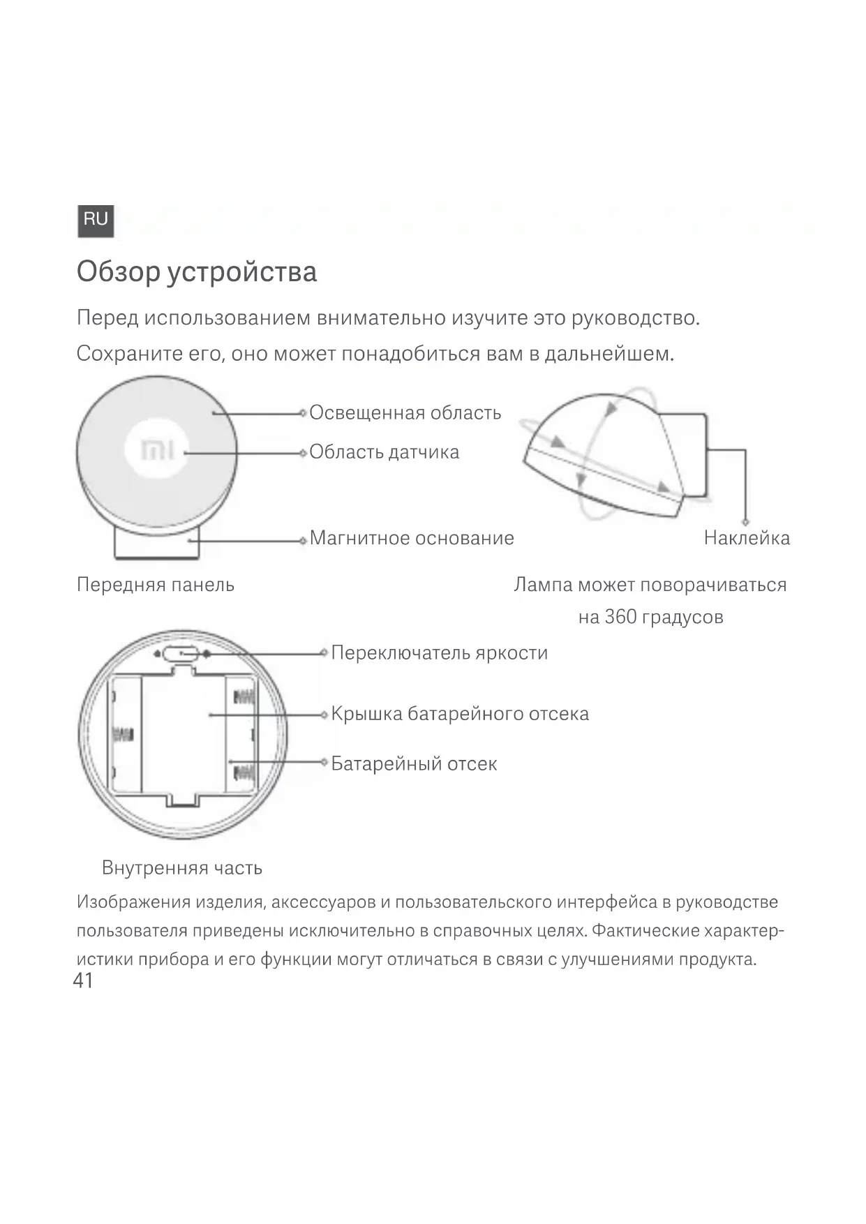 RUвоздуха или электрические чайники. Убедитесь в том, что логотип Mi всегда расположен вертикально при установке и использовании ночника. При понижении яркости ночника после определенного периода нормальной эксплуатации, уровень заряда батареек может быть недостаточным. Замените батарейки новыми и надлежащим образом утилизируйте старые батарейки, чтобы не допустить загрязнения окружающей среды. Выполнять замену источника света в этом светильнике могут только производитель, сервисный центр или квалифицированный специалист. Использовать только в помещениях. При установке батареек обращайте внимание на расположение позитивного (+) и негативного (-) полюсов. После разрядки неперезаряжаемых батареек их нельзя заряжать. Нельзя одновременно использовать новые и старые батарейки или батарейки разного типа.