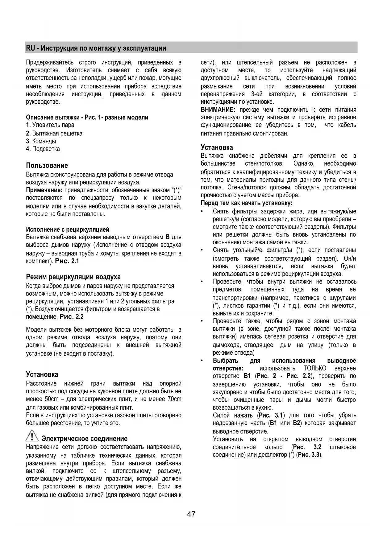 Внимание! Не подключите прибор к электрической сети, пока операции по установке полностью не завершены. Прежде чем приступить к операциям по очистке или уходе отсоедините вытяжку от сети, вынув вилку или выключив общий выключатель электрической сети. Прибор не подходит для использования детьми или лицами, неполноценными по своим умственным или сенсорным способностями, или не обладающими достаточным опытом или знаниями, если не под присмотром, или если они не были обучены пользованию аппаратурой со стороны лица, отвечающего за их безопасность. Не оставьте детей без присмотра, чтобы они не играли с