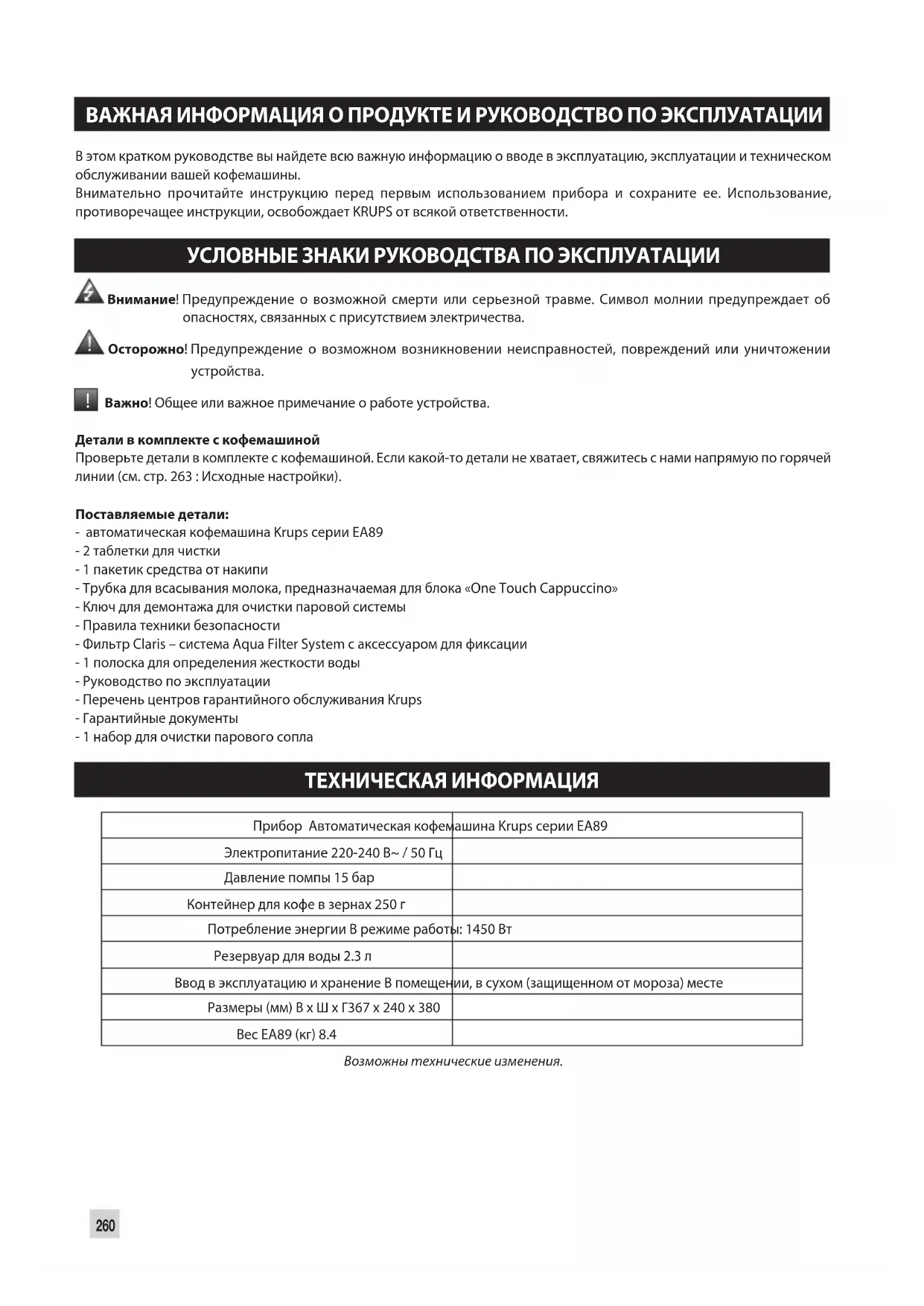 Важно! Общее или важное примечание о работе устройства. Детали в комплекте с кофемашиной Проверьте детали в комплекте с кофемашиной. Если какой-то детали не хватает, свяжитесь с нами напрямую по горячей линии (см. стр. 263 : Исходные настройки). Поставляемые детали: - автоматическая кофемашина Krups серии EA89 - 2 таблетки для чистки - 1 пакетик средства от накипи - Трубка для всасывания молока, предназначаемая для блока «One Touch Cappuccino» - Ключ для демонтажа для очистки паровой системы - Правила техники безопасности - Фильтр Claris – система Aqua Filter System с аксессуаром для фиксации - 1 полоска для определения жесткости воды - Руководство по эксплуатации - Перечень центров гарантийного обслуживания Krups - Гарантийные документы - 1 набор для очистки парового сопла ТЕХНИЧЕСКАЯ ИНФОРМАЦИЯ Прибор Автоматическая кофемашина Krups серии EA89 Электропитание 220-240 В~ / 50 Гц Давление помпы 15 бар Контейнер для кофе в зернах 250 г Потребление энергии В режиме работы: 1450 Вт Резервуар для воды 2.3 л Ввод в эксплуатацию и хранение В помещении, в сухом (защищенном от мороза) месте Размеры (мм) В x Ш x Г 367 x 240 x 380 Вес EA89 (кг) 8.4 Возможны технические изменения.261