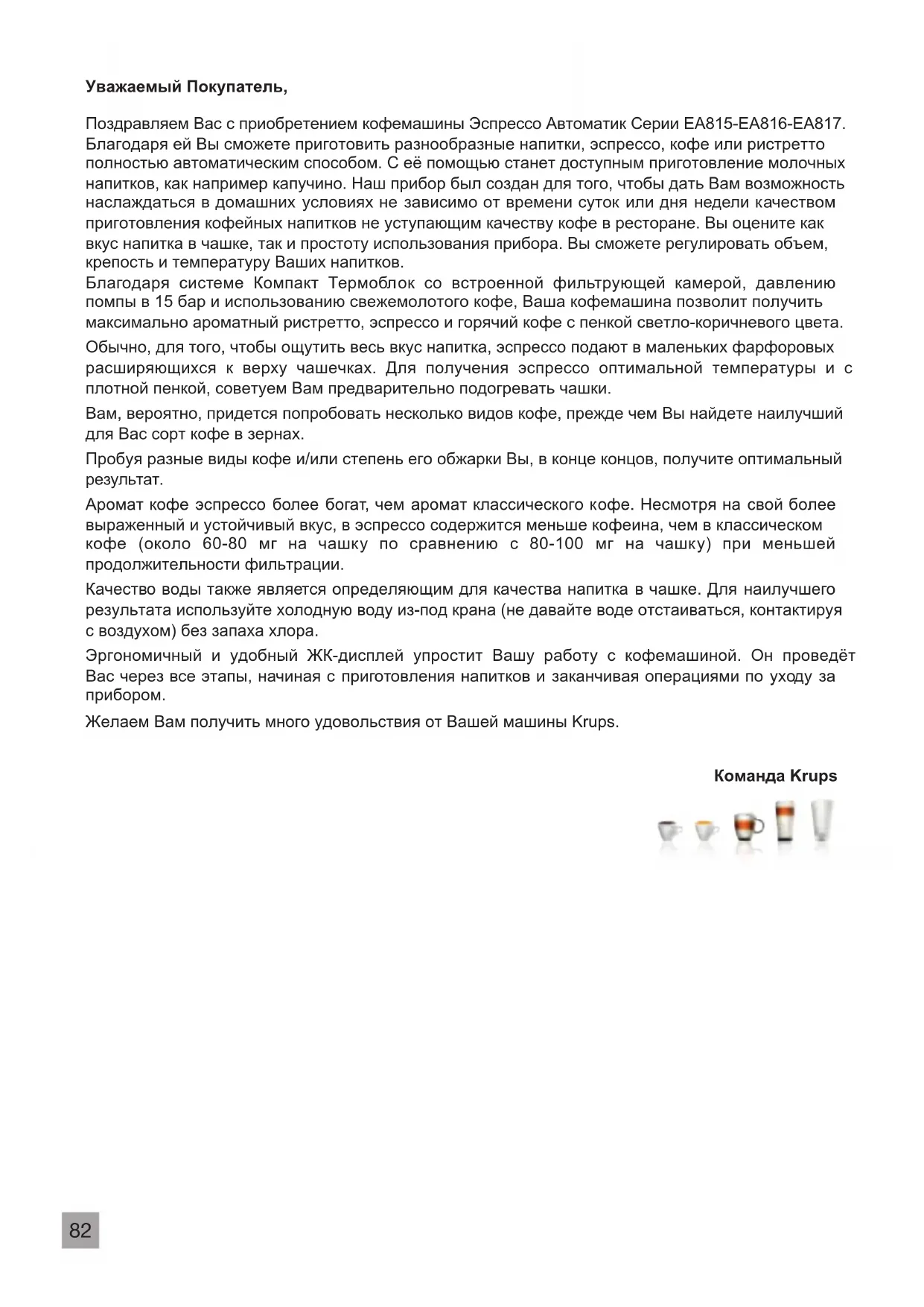 Η συσκευή λειτουργεί αλλά δεν εξέρχεται κάποιο υγρό. Επιβεβαιώστε ότι το δοχείο νερού είναι στη θέση του και το καλώδιο δεν έχει στριμωχτεί μεταξύ σώματος της συσκευής και δοχείου νερού. Υπάρχει άλεσμα καφέ στο δοχείο συλλογής υγρού. Αυτό γίνεται σε περίπτωση που το άλεσμα πέφτει έξω σπό τον κάδο της καφετιέρας, έτσι διατηρείται η μηχανή καθαρή. Κίνδυνος: Μόνο ειδικευμένος τεχνικός είναι αρμόδιος να πραγματοποιεί επισκευές στο καλώδιο ηλεκτρικού ρεύματος και να παρεμβαίνει στο δίκτυο ηλεκτροδότησης. Σε περίπτωση μη τήρησης της εν λόγω σύστασης, εκτίθεστε σε κίνδυνο θανάτου από ηλεκτροπληξία! Ποτέ μην χρησιμοποιείτε μια συσκευή που παρουσιάζει εμφανείς βλάβες!82 УважаемыйПокупатель, Поздравляем Вас с приобретением кофемашины Эспрессо Автоматик Серии EA815-EA816-EA817. Благодаря ей Вы сможете приготовить разнообразные напитки, эспрессо, кофе или ристретто полностью автоматическим способом. С её помощью станет доступным приготовление молочных напитков, как например капучино. Наш прибор был создан для того, чтобы дать Вам возможность наслаждаться в домашних условиях не зависимо от времени суток или дня недели качеством приготовления кофейных напитков не уступающим качеству кофе в ресторане. Вы оцените как вкус напитка в чашке, так и простоту использования прибора. Вы сможете регулировать объем, крепость и температуру Ваших напитков. Благодаря системе Компакт Термоблок со встроенной фильтрующей камерой, давлению помпы в 15 бар и использованию свежемолотого кофе, Ваша кофемашина позволит получить максимально ароматный ристретто, эспрессо и горячий кофе с пенкой светло-коричневого цвета. Обычно, для того, чтобы ощутить весь вкус напитка, эспрессо подают в маленьких фарфоровых расширяющихся к верху чашечках. Для получения эспрессо оптимальной температуры и с плотной пенкой, советуем Вам предварительно подогревать чашки. Вам, вероятно, придется попробовать несколько видов кофе, прежде чем Вы найдете наилучший для Вас сорт кофе в зернах. Пробуя разные виды кофе и/или степень его обжарки Вы, в конце концов, получите оптимальный