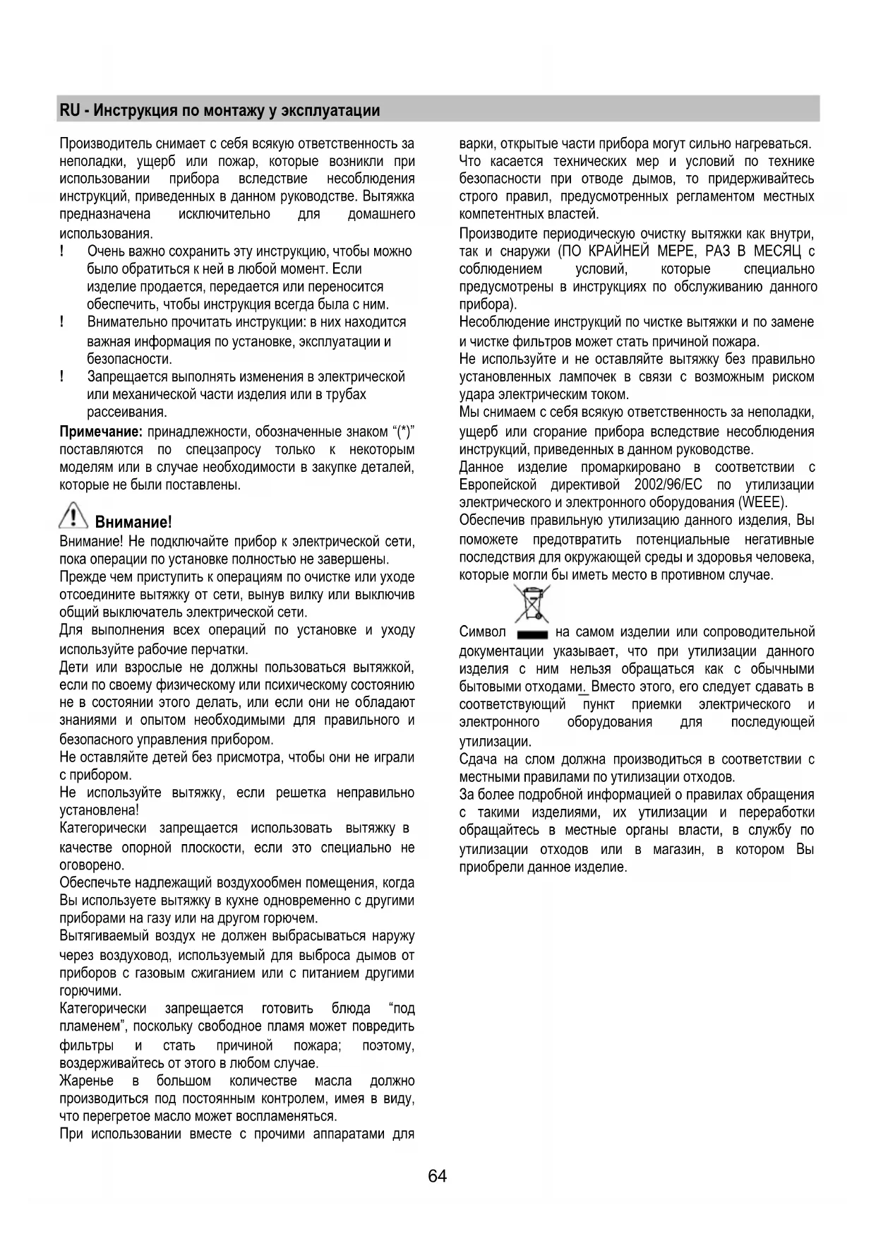 Несоблюдение инструкций по чистке вытяжки и по замене и чистке фильтров может стать причиной пожара. Не используйте и не оставляйте вытяжку без правильно установленных лампочек в связи с возможным риском удара электрическим током. Мы снимаем с себя всякую ответственность за неполадки, ущерб или сгорание прибора вследствие несоблюдения инструкций, приведенных в данном руководстве. Данное изделие промаркировано в соответствии с Европейской директивой 2002/96/EC по утилизации электрического и электронного оборудования (WEEE). Обеспечив правильную утилизацию данного изделия, Вы поможете предотвратить потенциальные негативные последствия для окружающей среды и здоровья человека, которые могли бы иметь место в противном случае.