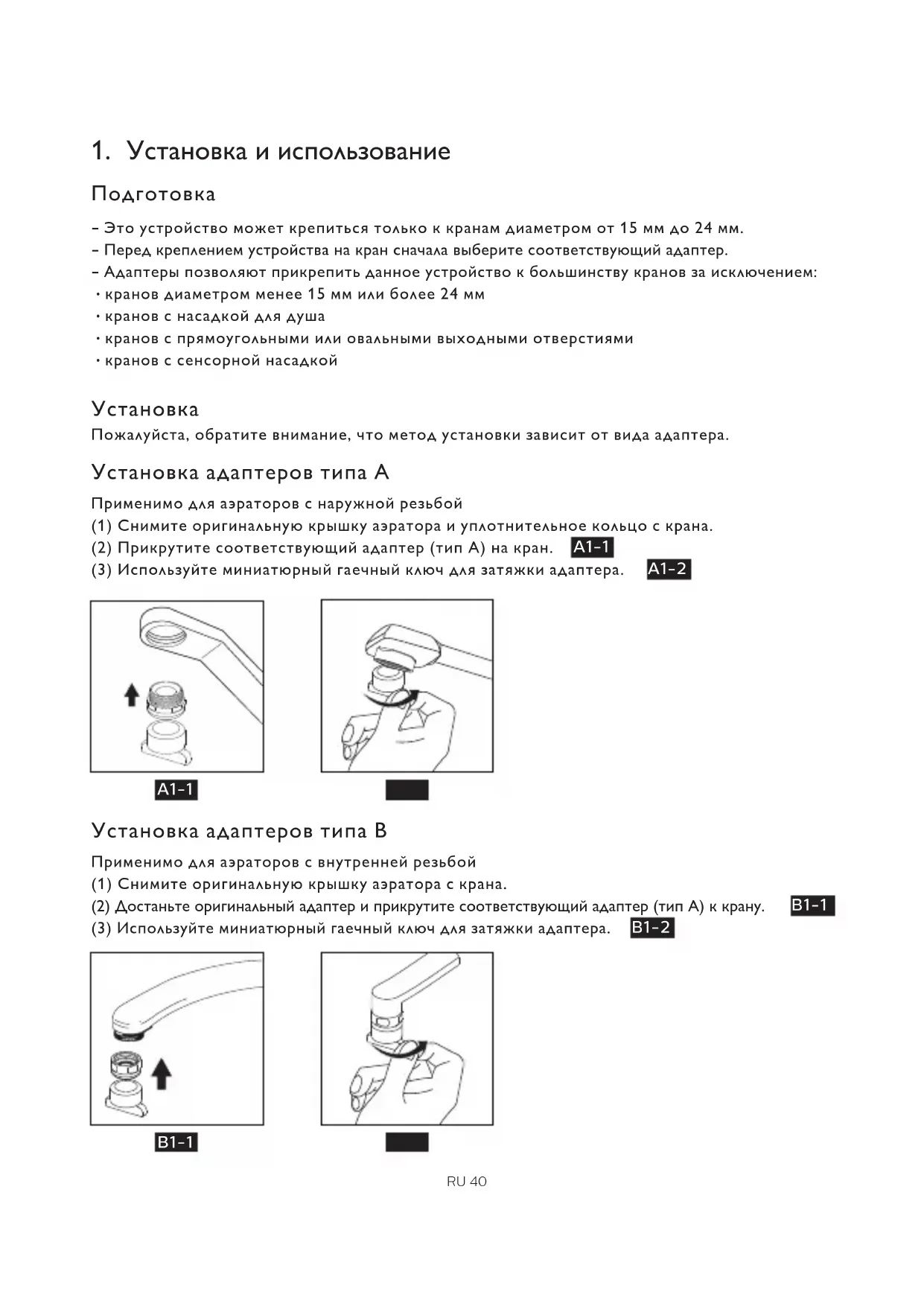Пожалуйста, обратите внимание, что метод установки зависит от вида адаптера. Установка адаптеров типа А Применимо для аэраторов с наружной резьбой (1) Снимите оригинальную крышку аэратора и уплотнительное кольцо с крана. (2) Прикрутите соответствующий адаптер (тип A) на кран. (3) Используйте миниатюрный гаечный ключ для затяжки адаптера. Установка адаптеров типа B Применимо для аэраторов с внутренней резьбой (1) Снимите оригинальную крышку аэратора с крана. (2) Достаньте оригинальный адаптер и прикрутите соответствующий адаптер (тип А) к крану. (3) Используйте миниатюрный гаечный ключ для затяжки адаптера. RU 40 B1-1 B1-2 A1-1 A1-1 A1-2 A1-2Ежедневное использование AWP3703, AWP3753: Нажимайте кнопку PUSH, чтобы переключаться между режимами с фильтрацией и без фильтрации. - Режим душа без фильтрации Нажмите кнопку PUSH, чтобы выбрать режим - Режим струи c фильтрацией Нажмите кнопку PUSH еще раз, чтобы выбрать режим. Установка адаптера типа C Применимо для кранов, отличных от A или B типа, диаметром 15 мм-21 мм. Пожалуйста, заранее подготовьте шлицевую отвертку перед установкой. Адаптер типа C (1) Потребуется ли внутреннее или внешнее уплотнительное кольцо адаптера типа С, зависит от размера выходного отверстия крана. (2) Совместите адаптер типа А с адаптером типа С. (3) Отрегулируйте и прикрутите комбинированный адаптер к крану.