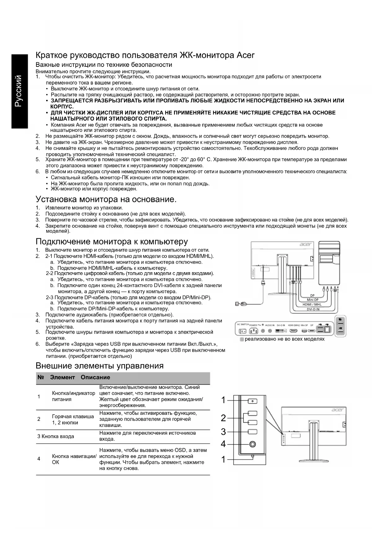 4Русский Правила ипримечания по технике безопасности Примечание FCC Данное устройство было протестировано ипризнано соответствующим ограничениям для цифрового устройства класса B, в соответствии счастью 15 правил FCC. Эти ограничения разработаны для обеспечения приемлемой защиты от вредных помех при установке вжилых помещениях. Данное устройство генерирует, использует иможет излучать радиочастотную энергию. Если оно установлено и используется не в соответствии с инструкциями, оно может вызывать вредные помехи при радиосвязи. Однако, нет никакой гарантии, что помехи не будут возникать вкаждом конкретном случае. Если данное устройство вызывает вредные помехи для приема радио- и телевизионного сигнала, что можно определить, включив ивыключив устройство, пользователю рекомендуется попытаться устранить помехи, выполнив одно или несколько из следующих действий: Переориентировать или переместить приемную антенну. Увеличить расстояние между устройством иприемником. Подключите устройство к розетке вцепи, отличной от той, к которой подключен приемник. Обратитесь за помощью кдилеру или опытному специалисту по радио-/телевизионному оборудованию. Декларация соответствия CE Настоящим компания Acer Inc., заявляет, что данный ЖК-монитор соответствует основным требованиям идругим соответствующим положениям Директивы по электромагнитной совместимости 2014/30/EU, Директивы по низковольтному оборудованию 2014/35/ EU, Директивы об ограничении использования некоторых вредных веществ в электрическом и электронном оборудовании 2011/65/EU и Директивы 2009/125/EC относительно создания основы для установки требований кэкодизайну энергосберегающего продукта. Примечание: Чтобы не повредить монитор, не поднимайте его за основание. Примечание: Экранированные кабели Все подключения кдругим вычислительным устройствам должны производиться спомощью экранированных кабелей в соответствии справилами электромагнитной совместимости. Примечание: Монитор Acer предназначен для воспроизведения видеосигнала и визуального отображения информации, полученной с электронных носителей. Примечание: Периферийные устройства К данному оборудованию можно подключать только периферийные устройства (устройства ввода/вывода, оконечные устройства, принтеры ит. д.), сертифицированные на соответствие ограничениям класса B. Использование несертифицированных периферийных устройств может привести к возникновению помех вприеме радио- и телевизионных сигналов. Предупреждение Изменения или модификации, не одобренные производителем, могут привести к лишению пользователя полномочий на эксплуатацию данного устройства, предоставленных Федеральной комиссией по средствам коммуникаций. Условия эксплуатации Данное устройство соответствует требованиям части 15 правил FCC. Эксплуатация допускается при соблюдении следующих двух условий: (1) данное устройство не должно создавать вредных помех, и (2) данное устройство может принимать любые помехи, включая помехи, которые могут препятствовать нормальной эксплуатации. Примечание: Для пользователей в Канаде Данное цифровое устройство класса B соответствует канадскому стандарту ICES-003. Remarque à l'intention des utilisateurs canadiens Cet appareil numérique de la classe B est conforme à la norme NMB-003 du Canada. Утилизация отслужившего оборудования пользователями из частных домов в стран