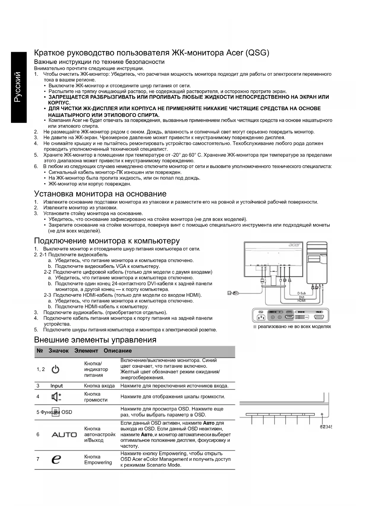 Empowering Нажмите кнопку Empowering, чтобы открыть OSD Acer eColor Management и получить доступ к режимам Scenario Mode. HDMI DVI D-SubHDMI реализовано не во всех моделях 1234567Русский Правила и примечания по технике безопасности Примечание FCC Данное устройство было протестировано и признано соответствующим ограничениям для цифрового устройства класса B, в соответствии с частью 15 правил FCC. Эти ограничения разработаны для обеспечения приемлемой защиты от вредных помех при установке в жилых помещениях. Данное устройство генерирует, использует и может излучать радиочастотную энергию. Если оно установлено и используется не в соответствии с инструкциями, оно может вызывать вредные помехи при радиосвязи. Однако нет гарантии, что помехи не будут возникать в каждом конкретном случае. Если данное устройство вызывает вредные помехи для приема радио- и телевизионного сигнала, что можно определить, включив и выключив устройство, пользователю рекомендуется попытаться устранить помехи, выполнив одно или несколько из следующих действий: Переориентируйте или переместите приемную антенну. Увеличьте расстояние между устройством и приемником. Подключите устройство к розетке в цепи, отличной от той, к которой подключен приемник. Обратитесь за помощью к дилеру или опытному специалисту по радио-/телевизионному оборудованию. Декларация соответствия CE Настоящим компания Acer Inc., заявляет, что данный ЖК-монитор соответствует основным требованиям и другим соответствующим положениям Директивы по электромагнитной совместимости 2014/30/EU, Директивы по низковольтному оборудованию 2014/35/ EU, Директивы об ограничении использования некоторых вредных веществ в электрическом и электронном оборудовании 2011/ 65/EU и Директивы 2009/125/EC относительно создания основы для установки требований к экодизайну энергосберегающего