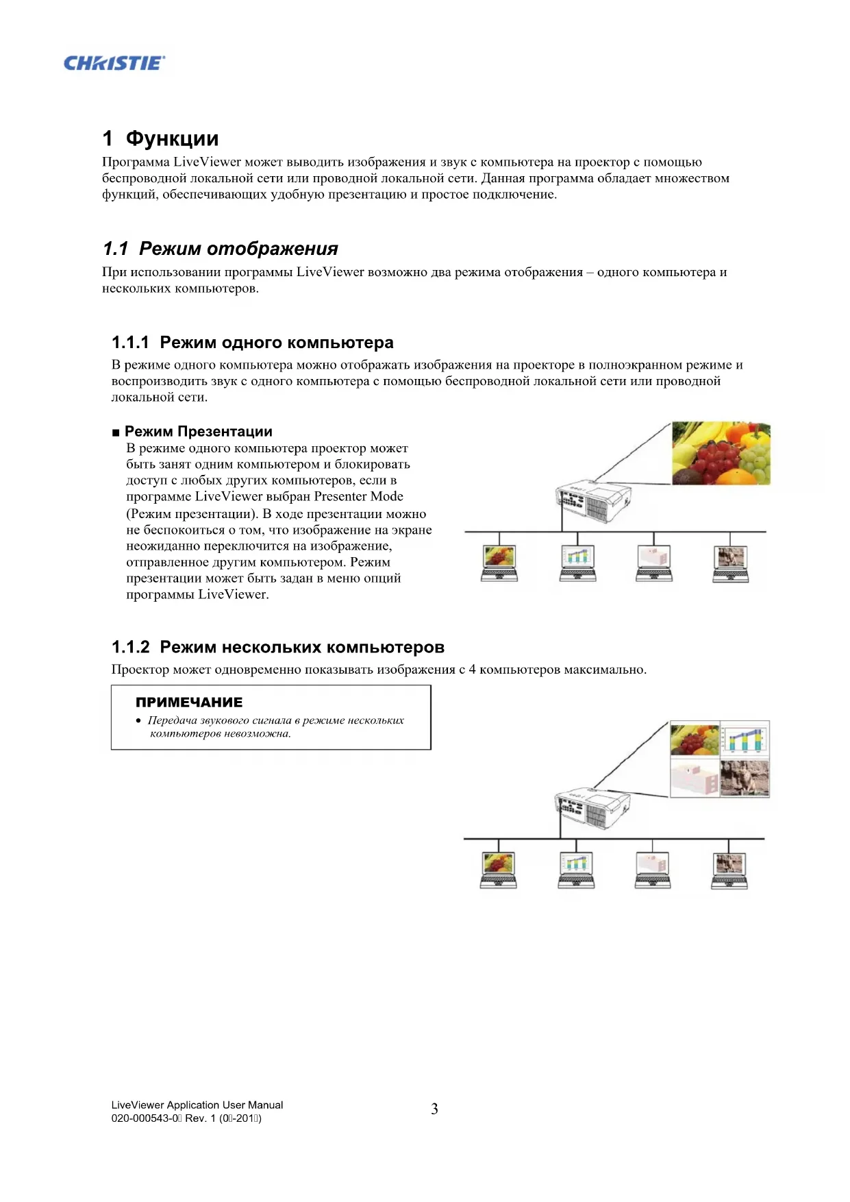 Приложение ..................................................................................................................... 36 LiveViewer Application User Manual 020-000543-0 Rev. 1 (0-201)3 1 Функции Программа LiveViewer может выводить изображения и звук с компьютера на проектор с помощью беспроводной локальной сети или проводной локальной сети. Данная программа обладает множеством функций, обеспечивающих удобную презентацию и простое подключение.