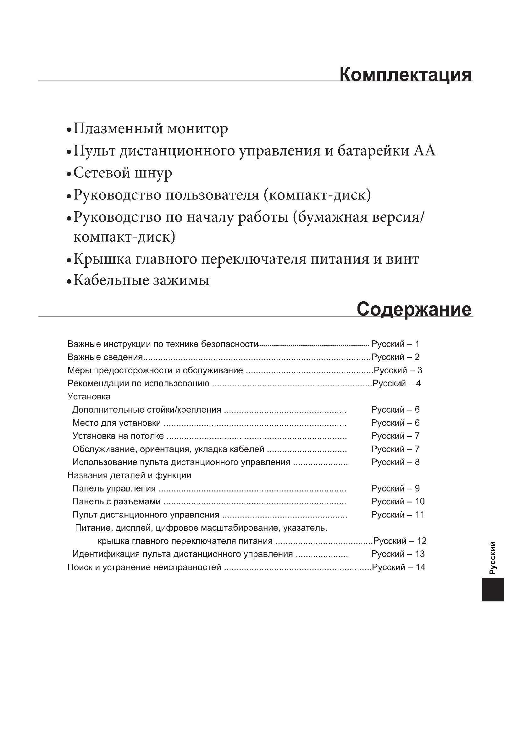 - Комплектация Плазменный монитор Пульт дистанционного управления и батарейки AA Сетевой шнур Руководство пользователя (компакт-диск) Руководство по началу работы (бумажная версия/ компакт-диск) Крышка главного переключателя питания и винт Кабельные зажимы