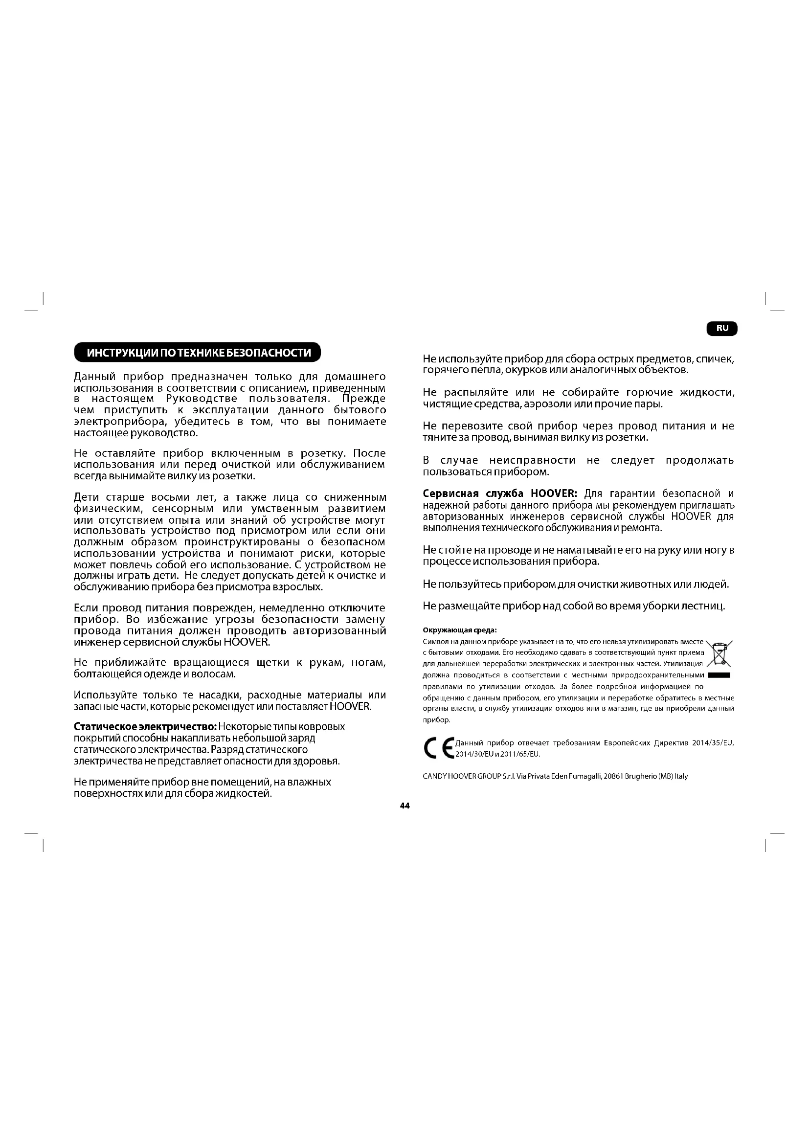ИНСТРУКЦИИ ПО ТЕХНИКЕ БЕЗОПАСНОСТИ Данный прибор предназначен только для домашнего использования в соответствии с описанием, приведенным в настоящем Руководстве пользователя. Прежде чем приступить к эксплуатации данного бытового электроприбора, убедитесь в том, что вы понимаете настоящее руководство. Не оставляйте прибор включенным в розетку. После использования или перед очисткой или обслуживанием всегда вынимайте вилку из розетки. Дети старше восьми лет, а также лица со сниженным физическим, сенсорным или умственным развитием или отсутствием опыта или знаний об устройстве могут использовать устройство под присмотром или если они должным образом проинструктированы о безопасном использовании устройства и понимают риски, которые может повлечь собой его использование. С устройством не должны играть дети. Не следует допускать детей к очистке и обслуживанию прибора без присмотра взрослых. Если провод питания поврежден, немедленно отключите прибор. Во избежание угрозы безопасности замену провода питания должен проводить авторизованный инженер сервисной службы HOOVER. Не приближайте вращающиеся щетки к рукам, ногам, болтающейся одежде и волосам. Используйте только те насадки, расходные материалы или запасные части, которые рекомендует или поставляет HOOVER. Статическое электричество: Некоторые типы ковровых покрытий способны накапливать небольшой заряд статического электричества. Разряд статического электричества не представляет опасности для здоровья. Не применяйте прибор вне помещений, на влажных поверхностях или для сбора жидкостей. Не используйте прибор для сбора острых предметов, спичек, горячего пепла, окурков или аналогичных объектов. Не распыляйте или не собирайте горючие жидкости, чистящие средства, аэрозоли или прочие пары. Не перевозите свой прибор через провод питания и не тяните за провод, вынимая вилку из розетки. В случае неисправности не следует продолжать пользоваться прибором. Сервисная служба HOOVER: Для гарантии безопасной и надежной работы данного прибора мы рекомендуем приглашать авторизованных инженеров сервисной службы HOOVER для выполнения технического обслуживания и ремонта. Не стойте на проводе и не наматывайте его на руку или ногу в процессе использования прибора. Не пользуйтесь прибором для очистки животных или людей. Не размещайте прибор над собой во время уборки лестниц. Окружающая среда: Символ на данном приборе указывает на то, что его нельзя утилизировать вместе с бытовыми отходами. Его необходимо сдавать в соответствующий пункт приема для дальнейшей переработки электрических и электронных частей. Утилизация должна проводиться в соответствии с местными природоохранительными правилами по утилизации отходов. За более подробной информацией по обращению с данным прибором, его утилизации и переработке обратитесь в местные органы власти, в службу утилизации отходов или в магазин, где вы приобрели данный