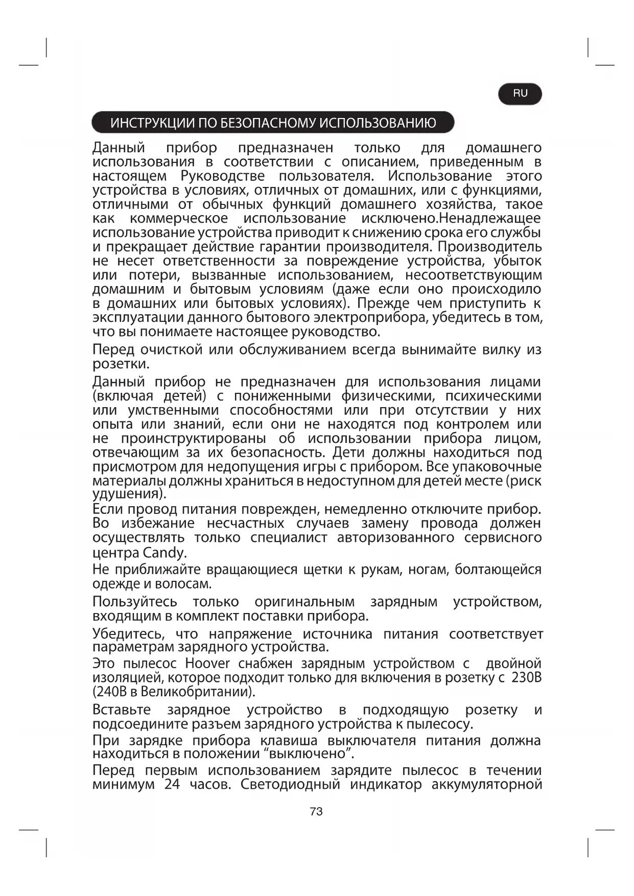 Если провод питания поврежден, немедленно отключите прибор. Во избежание несчастных случаев замену провода должен осуществлять только специалист авторизованного сервисного центра Candy. Не приближайте вращающиеся щетки к рукам, ногам, болтающейся одежде и волосам. Пользуйтесь только оригинальным зарядным устройством, входящим в комплект поставки прибора. Убедитесь, что напряжение источника питания соответствует параметрам зарядного устройства. Это пылесос Hoover снабжен зарядным устройством с двойной изоляцией, которое подходит только для включения в розетку с 230В (240В в Великобритании). Вставьте зарядное устройство в подходящую розетку и подсоедините разъем зарядного устройства к пылесосу. При зарядке прибора клавиша выключателя питания должна находиться в положении “выключено”. Перед первым использованием зарядите пылесос в течении минимум 24 часов. Светодиодный индикатор аккумуляторной RU74 батареи будет гореть красным во время зарядки и станет белым при полной зарядке. После использования всегда устанавливайте прибор на зарядное устройство с целью подзарядки батареи. Запрещается зарядка аккумуляторных батарей при температуре выше 37С или ниже 0С. Если во время зарядки коснуться зарядного устройства, то оно будет теплым, и это совершенно нормальное явление. Никогда не отключайте зарядное устройство, потянув за провод. Отключите зарядное устройство в случае длительного отсутствия (отпуск и т.д.) Перезарядите пылесос снова перед использованием, так как батарея может саморазрядиться за период хранения. При необходимости утилизации прибора достаньте из него батарею. Перед тем, как достать батарею, отключите прибор от электросети. Соблюдайте правила техники безопасности при утилизации батареи. Используйте прибор до тех пор, пока батарея полностью не разрядится. Использованные батареи необходимо сдавать в специальный пункт приема и не выбрасывать с обычными отходами. Чтобы извлечь батарею, свяжитесь с авторизованным сервисным центром Candy или следуйте приведенным далее инструкциям. ВНИМАНИЕ! Перед тем как извлечь батарею из пылесоса, убедитесь, что она полностью разряжена. Для этого используйте пылесос до полной разрядки батареи. Выньте вилку зарядного устройства из прибора. Нажмите кнопку извлечения батареи и достаньте батарею. [3] Примечание: В случае возникновения каких-либо сложностей с разборкой или при необходимости получения более подробной информации об обслуживании, утилизации и переработке данного прибора, обратитесь в местные органы власти или в местную службу по утилизации бытовых отходов. Используйте только рекомендуемые или поставляемые производителем насадки, расходные материалы или запасные