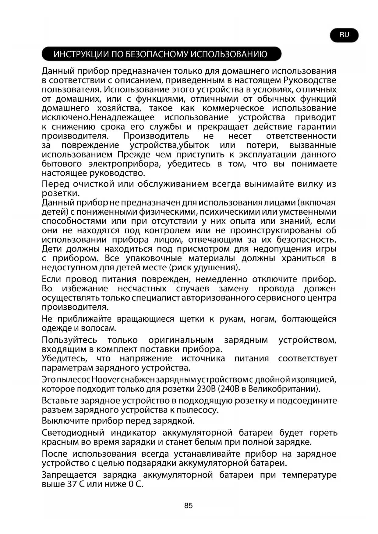 Данный прибор не предназначен для использования лицами (включая детей) с пониженными физическими, психическими или умственными способностями или при отсутствии у них опыта или знаний, если они не находятся под контролем или не проинструктированы об использовании прибора лицом, отвечающим за их безопасность. Дети должны находиться под присмотром для недопущения игры с прибором. Все упаковочные материалы должны храниться в недоступном для детей месте (риск удушения). Если провод питания поврежден, немедленно отключите прибор. Во избежание несчастных случаев замену провода должен осуществлять только специалист авторизованного сервисного центра производителя. Не приближайте вращающиеся щетки к рукам, ногам, болтающейся одежде и волосам. Пользуйтесь только оригинальным зарядным устройством, входящим в комплект поставки прибора. Убедитесь, что напряжение источника питания соответствует параметрам зарядного устройства. Это пылесос Hoover снабжен зарядным устройством с двойной изоляцией, которое подходит только для розетки 230В (240В в Великобритании). Вставьте зарядное устройство в подходящую розетку и подсоедините разъем зарядного устройства к пылесосу. Выключите прибор перед зарядкой. Светодиодный индикатор аккумуляторной батареи будет гореть красным во время зарядки и станет белым при полной зарядке. После использования всегда устанавливайте прибор на зарядное устройство с целью подзарядки аккумуляторной батареи. Запрещается зарядка аккумуляторной батареи при температуре выше 37 С или ниже 0 С. RU86 Совершенно нормально, если во время зарядки коснуться зарядного устройства, то оно будет теплым. Никогда не отключайте зарядное устройство, потянув за провод. Отключите зарядное устройство в случае длительного отсутствия (отпуск и т.д.) Зарядите пылесос снова перед использованием, так как аккумуляторная батарея может саморазрядиться за период хранения. При необходимости утилизации прибора выньте из него аккумуляторную батарею. Перед тем, как достать батарею, отключите прибор от электросети. Соблюдайте правила техники безопасности при утилизации аккумуляторной батареи. Используйте прибор до тех пор, пока батарея полностью не разрядится. Использованные аккумуляторные батареи необходимо сдавать в специальный пункт приема и не выбрасывать с обычными бытовыми отходами. Чтобы извлечь батарею, свяжитесь с авторизованным сервисным центром или следуйте приведенным далее инструкциям ВНИМАНИЕ! Перед тем как извлечь батарею из пылесоса, она должна быть полностью разряжена. Для этого используйте пылесос до полной разрядки аккумуляторной