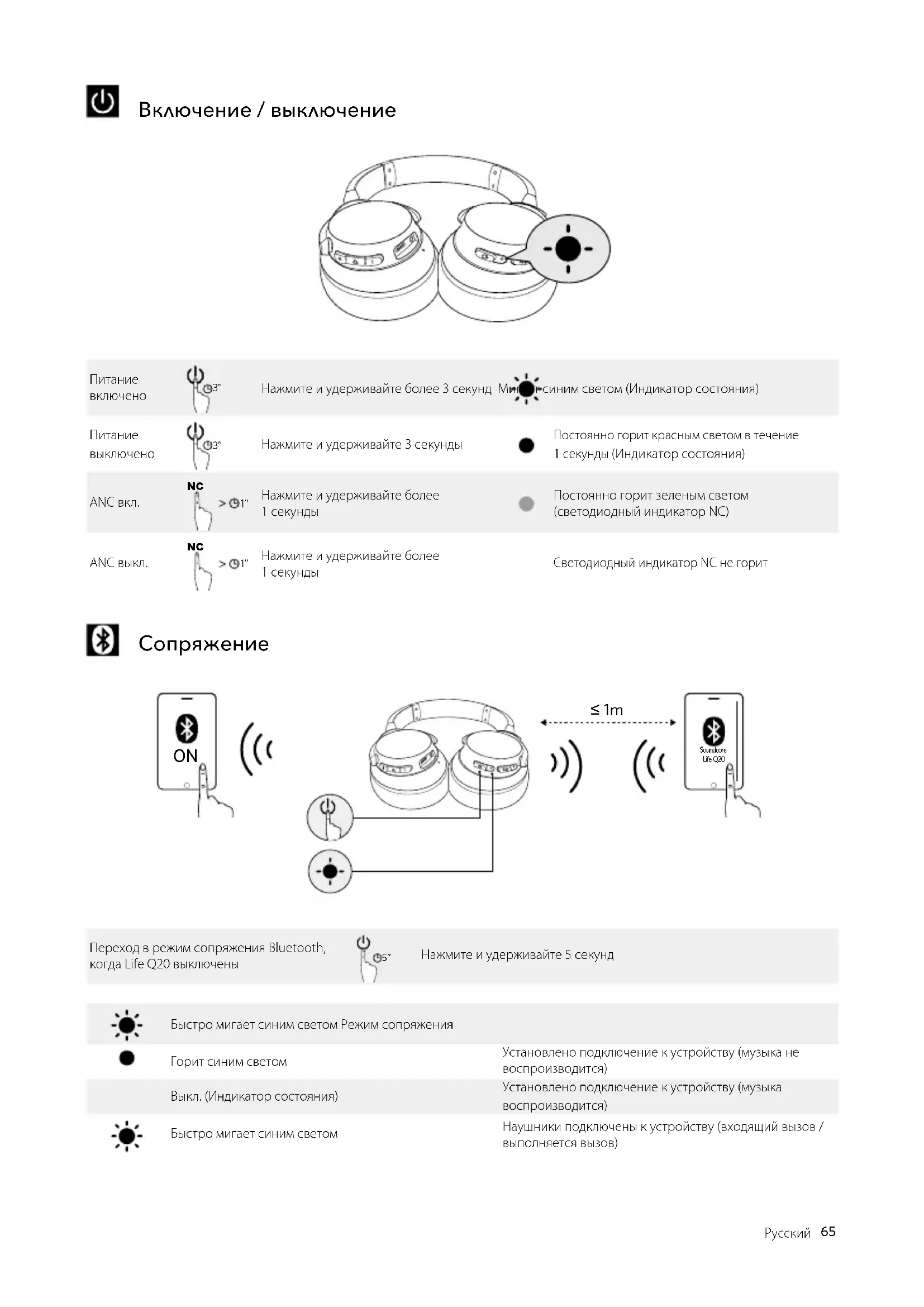 ≤ 1m Soundcore Life Q20 Переход в режим сопряжения Bluetooth, когда Life Q20 выключены