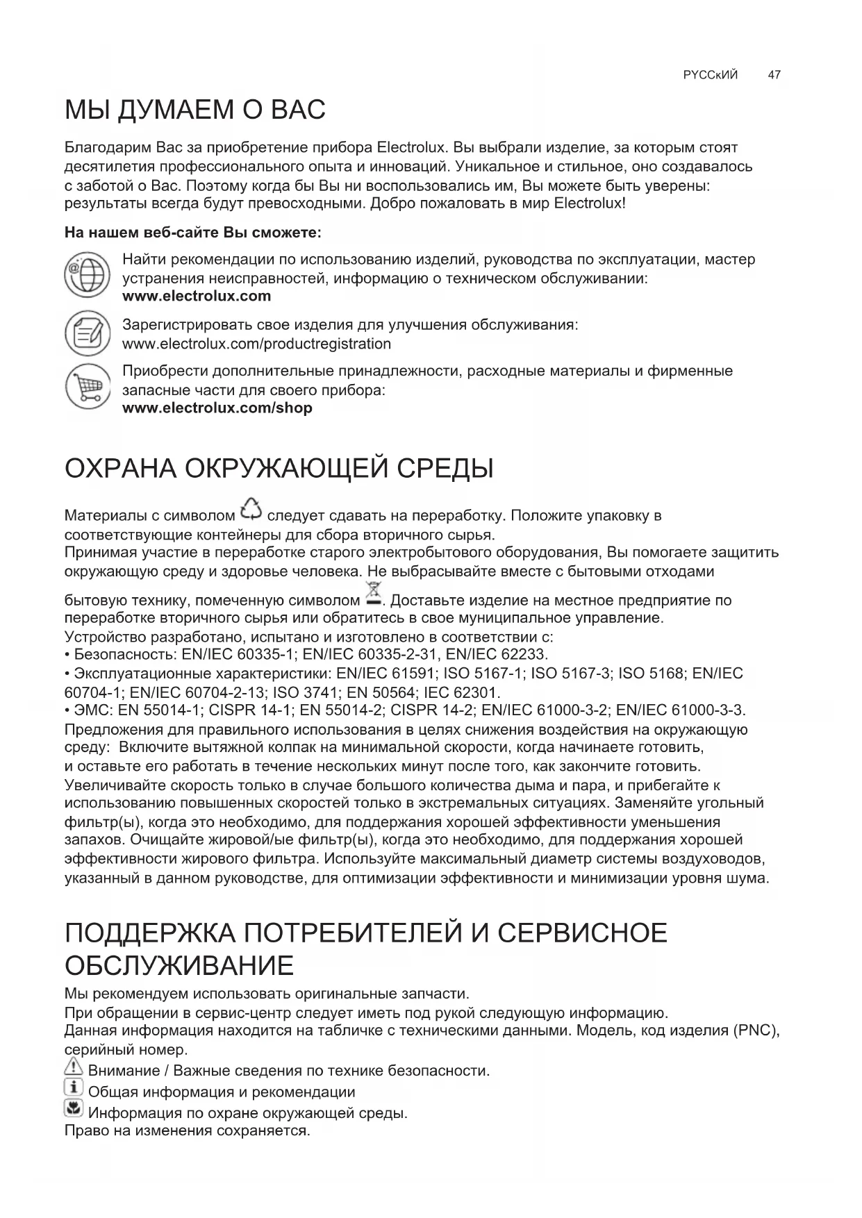 рекомендации по использованию изделий, руководства по эксплуатации, мастер устранения неисправностей, информацию о техническом обслуживании: www.electrolux.com Зарегистрировать свое изделия для улучшения обслуживания: www.electrolux.com/productregistration Приобрести дополнительные принадлежности, расходные материалы и фирменные запасные части для своего прибора: www.electrolux.com/shop ОХРАНА ОКРУЖАЮЩЕЙ СРЕДЫ Материалы с символом следует сдавать на переработку. Положите упаковку в соответствующие контейнеры для сбора вторичного сырья. Принимая участие в переработке старого электробытового оборудования, Вы помогаете защитить окружающую среду и здоровье человека. Не выбрасывайте вместе с бытовыми отходами бытовую технику, помеченную символом . Доставьте изделие на местное предприятие по переработке вторичного сырья или обратитесь в свое муниципальное управление. Устройство разработано, испытано и изготовлено в соответствии с: