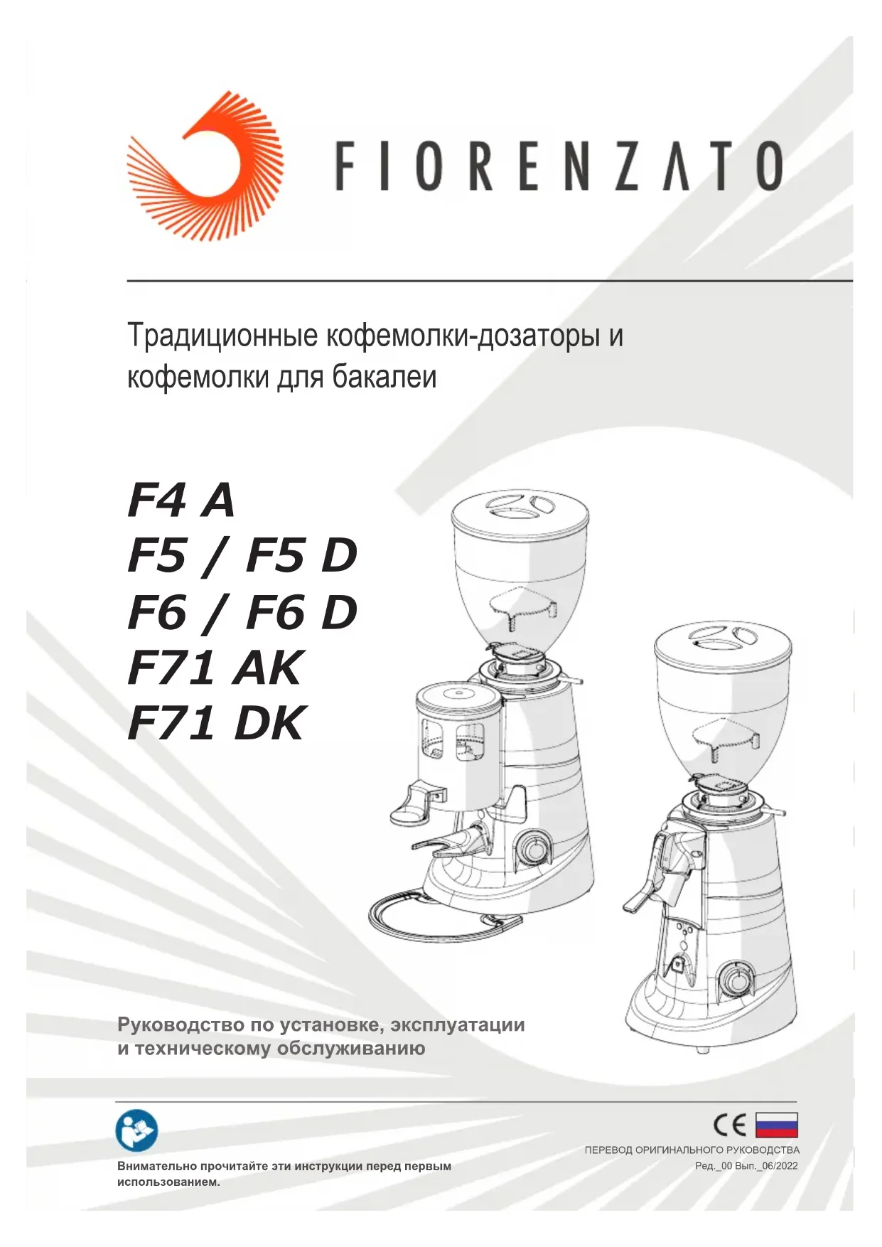 PÁGINA VAZIARev_00-Ed_06/2022-Cod.F4A-F5/F5D-F6/F6D-F71AK/F71DK_00 Fiorenzato M.C. S.r.l. ViaRivale,18-SantaMariadiSala(VE)-ITALY Tel.+39/049628716-Fax.+39/0498956200 info@orenzato.it-www.orenzato.itРуководство по установке, эксплуатации и техническому обслуживанию Внимательно прочитайте эти инструкции перед первым использованием. ПЕРЕВОД ОРИГИНАЛЬНОГО РУКОВОДСТВА Ред._00 Вып._06/2022 F4 A F5 / F5 D F6 / F6 D F71 AK F71 DK Традиционные кофемолки-дозаторы и кофемолки для бакалеиFiorenzato | Кофемолки-дозаторы/кофемолки для бакалеи_00 Ред. 06/2022 2 / 40