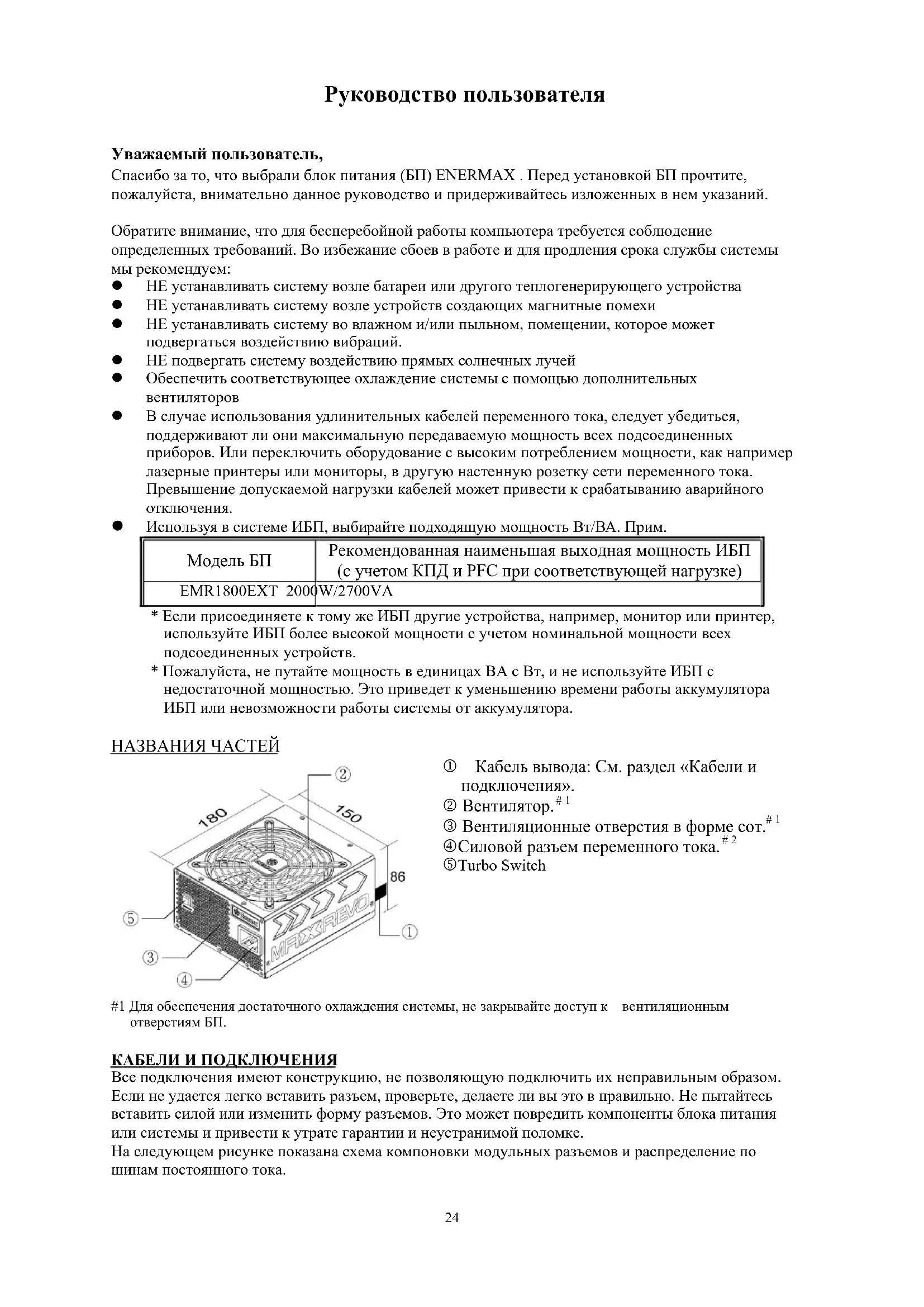 Руководство пользователя Уважаемый пользователь, Спасибо за то, что выбрали блок питания (БП) ENERMAX . Перед установкой БП прочтите, пожалуйста, внимательно данное руководство и придерживайтесь изложенных в нем указаний. Обратите внимание, что для бесперебойной работы компьютера требуется соблюдение определенных требований. Во избежание сбоев в работе и для продления срока службы системы мы рекомендуем: НЕ устанавливать систему возле батареи или другого теплогенерирующего устройства НЕ устанавливать систему возле устройств создающих магнитные помехи НЕ устанавливать систему во влажном и/или пыльном, помещении, которое может подвергаться воздействию вибраций. НЕ подвергать систему воздействию прямых солнечных лучей Обеспечить соответствующее охлаждение системы с помощью дополнительных вентиляторов В случае использования удлинительных кабелей переменного тока, следует убедиться, поддерживают ли они максимальную передаваемую мощность всех подсоединенных приборов. Или переключить оборудование с высоким потреблением мощности, как например лазерные принтеры или мониторы, в другую настенную розетку сети переменного тока. Превышение допускаемой нагрузки кабелей может привести к срабатыванию аварийного отключения. Используя в системе ИБП, выбирайте подходящую мощность Вт/ВА. Прим.