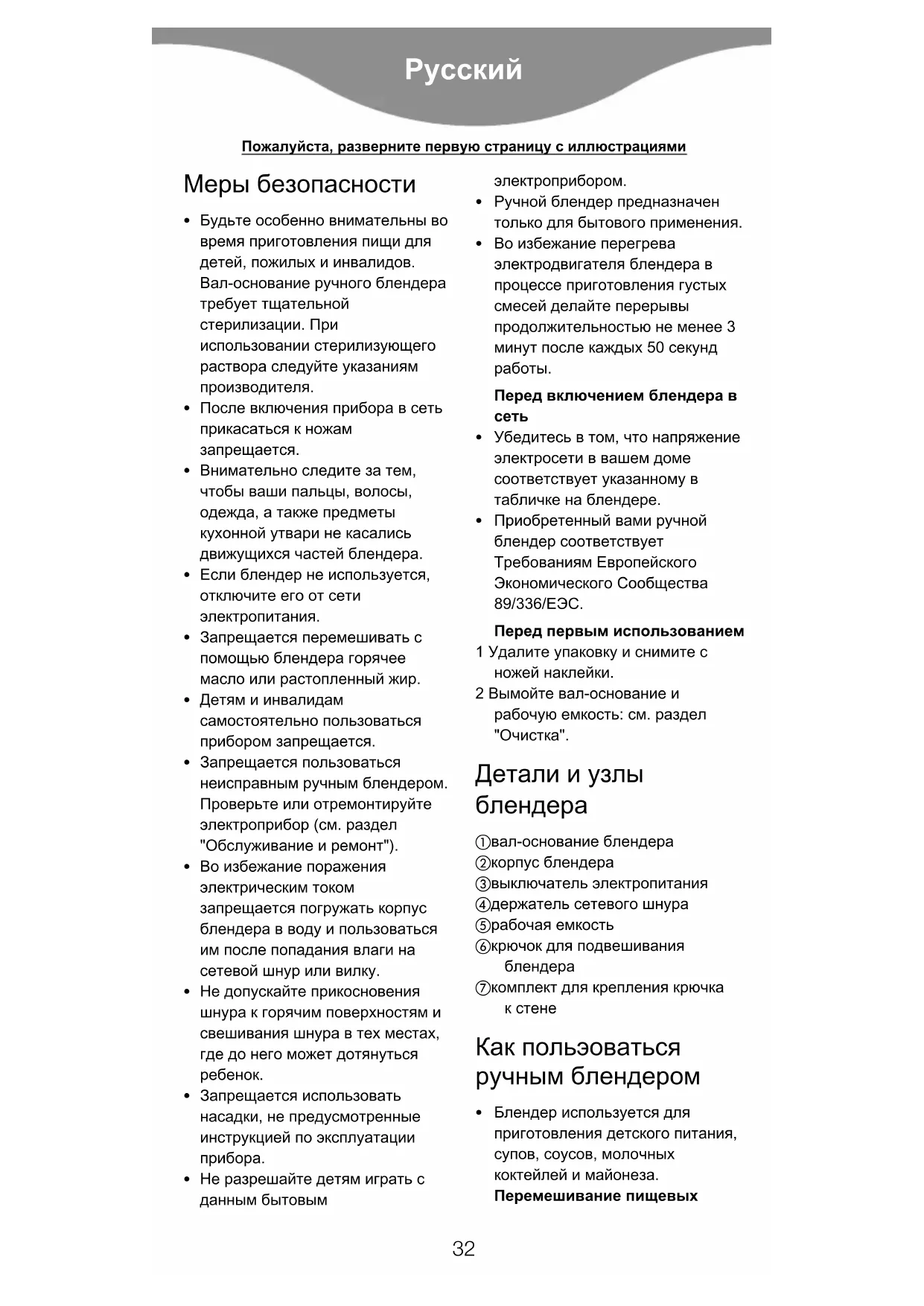Приобретенный вами ручной блендер соответствует Требованиям Европейского Экономического Сообщества 89/336/ЕЭС. Перед первым использованием 1 Удалите упаковку и снимите с ножей наклейки. 2 Вымойте вал-основание и рабочую емкость: см. раздел