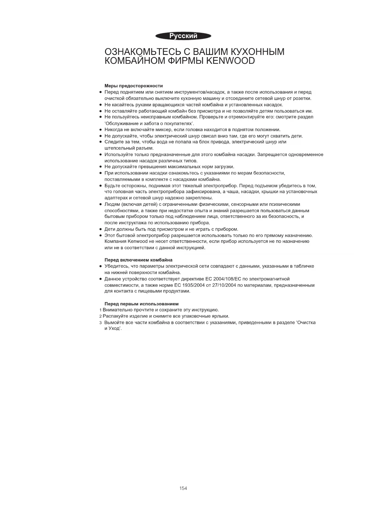 Этот бытовой электроприбор разрешается использовать только по его прямому назначению. Компания Kenwood не несет ответственности, если прибор используется не по назначению или не в соответствии с данной инструкцией. Перед включением комбайна