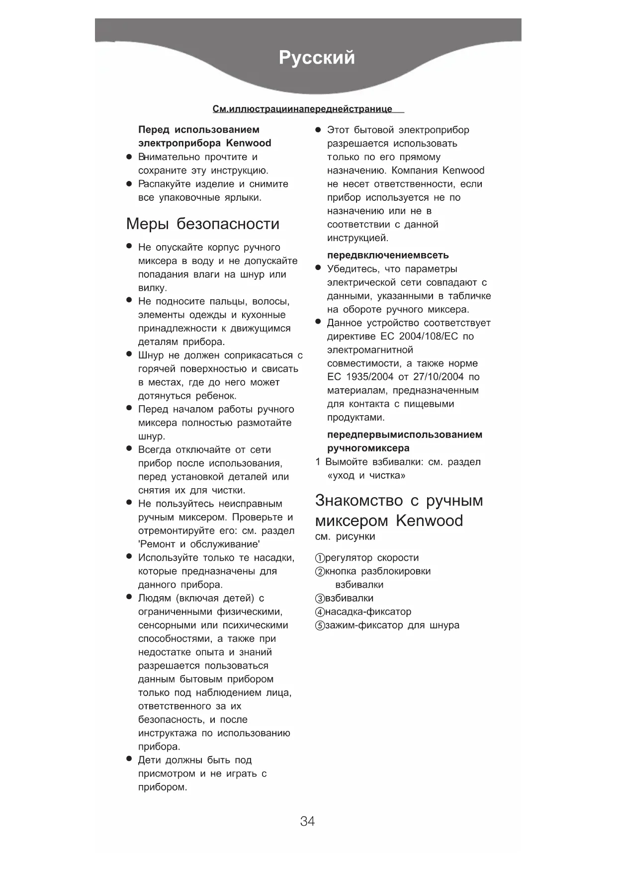 Данное устройство соответствует директиве ЕС 2004/108/EC по электромагнитной совместимости, а также норме ЕС 1935/2004 от 27/10/2004 по материалам, предназначенным для контакта с пищевыми продуктами. перед первым использованием ручного миксера 1 Вымойте взбивалки: см. раздел «уход и чистка» Знакомство с ручным миксером Kenwood см. рисунки 햲 регулятор скорости 햳 кнопка разблокировки