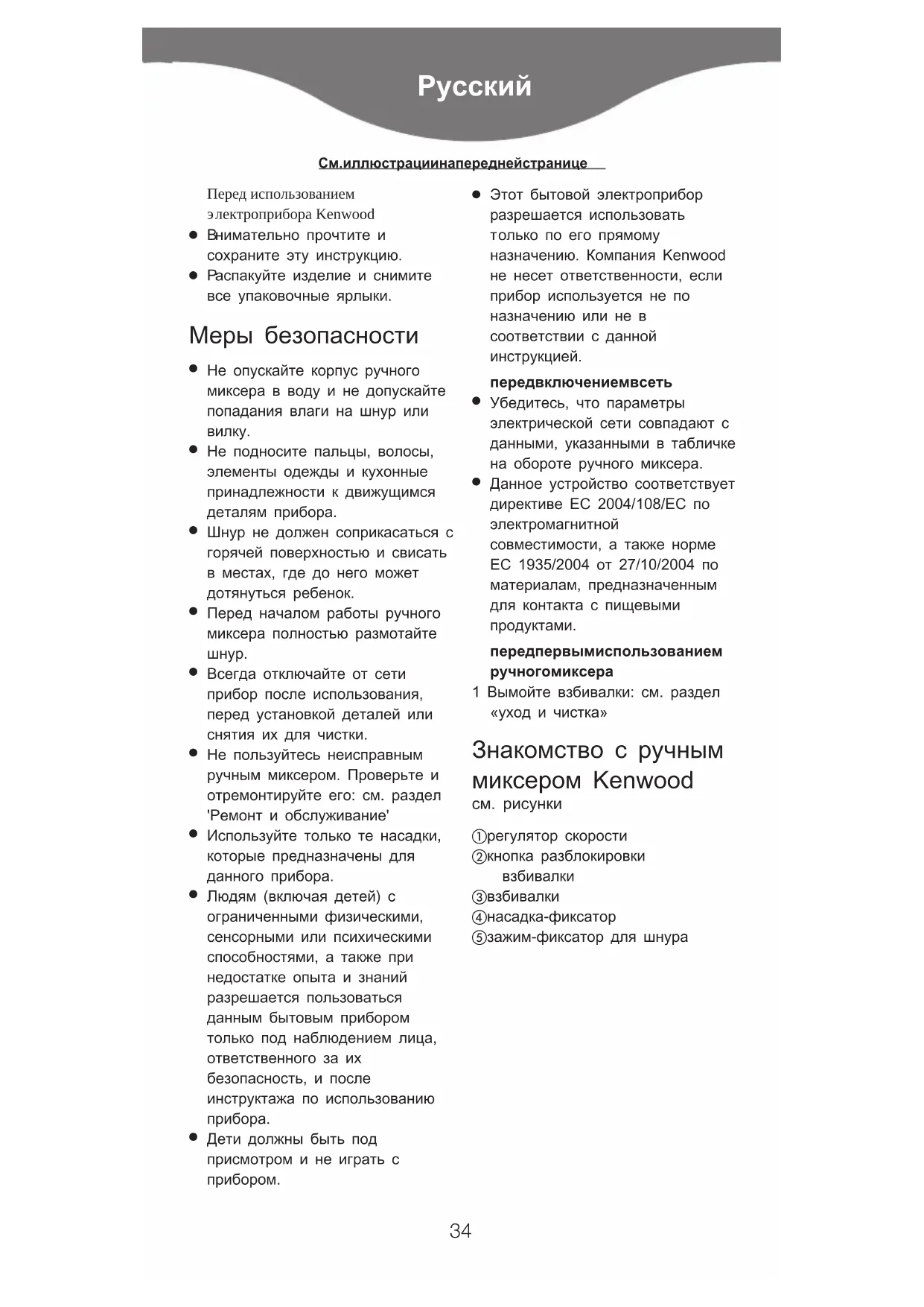 Данное устройство соответствует директиве ЕС 2004/108/EC по электромагнитной совместимости, а также норме ЕС 1935/2004 от 27/10/2004 по материалам, предназначенным для контакта с пищевыми продуктами. перед первым использованием ручного миксера 1 Вымойте взбивалки: см. раздел «уход и чистка» Знакомство с ручным миксером Kenwood см. рисунки 햲 регулятор скорости 햳 кнопка разблокировки