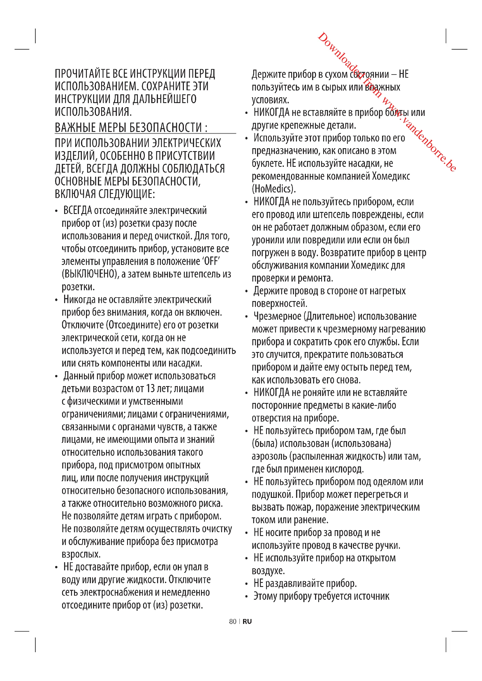 - Этому прибору требуется источник Downloaded from www.vandenborre.be81 I RU его от розетки и свяжитесь с центром обслуживания компании HoMedics.