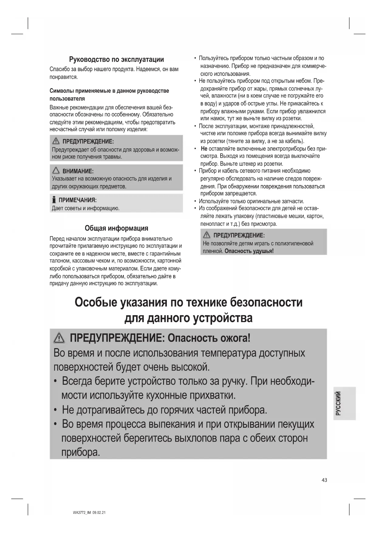 В следующий раз уменьшите время выпечки. Технические данные Модель: ................................................................... WA 3772 Электропитание: ...............................220 - 240 В~, 50 / 60 Гц Потребляемая мощность: ......................................700 ватт Класс защиты: ...................................................................... Вес нетто: .....................................................примерно 1,5 кг Сохранено право на технические и конструкционные изменения в рамках продолжающейся разработки