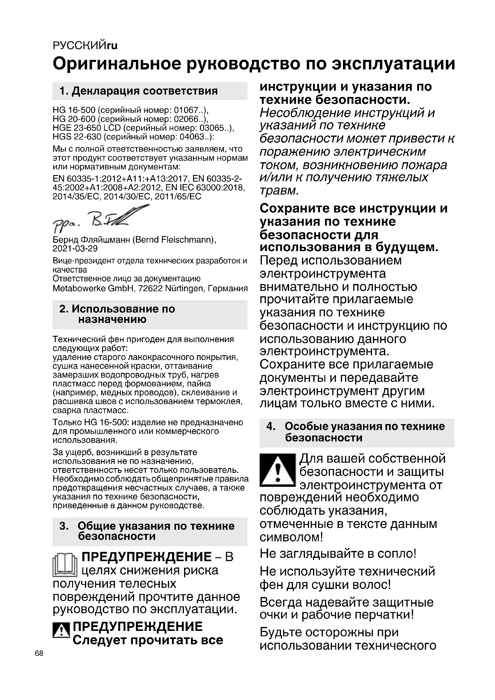 Оригинальное руководство по эксплуатации HG 16-500 (серийный номер: 01067..), HG 20-600 (серийный номер: 02066..), HGE 23-650 LCD (серийный номер: 03065..), HGS 22-630 (серийный номер: 04063..): Мы с полной ответственностью заявляем, что этот продукт соответствует указанным нормам или нормативным документам: EN 60335-1:2012+A11:+A13:2017, EN 60335-2- 45:2002+A1:2008+A2:2012, EN IEC 63000:2018, 2014/35/ЕС, 2014/30/ЕС, 2011/65/ЕС Бернд Фляйшманн (Bernd Fleischmann), 2021-03-29 Вице-президент отдела технических разработок и