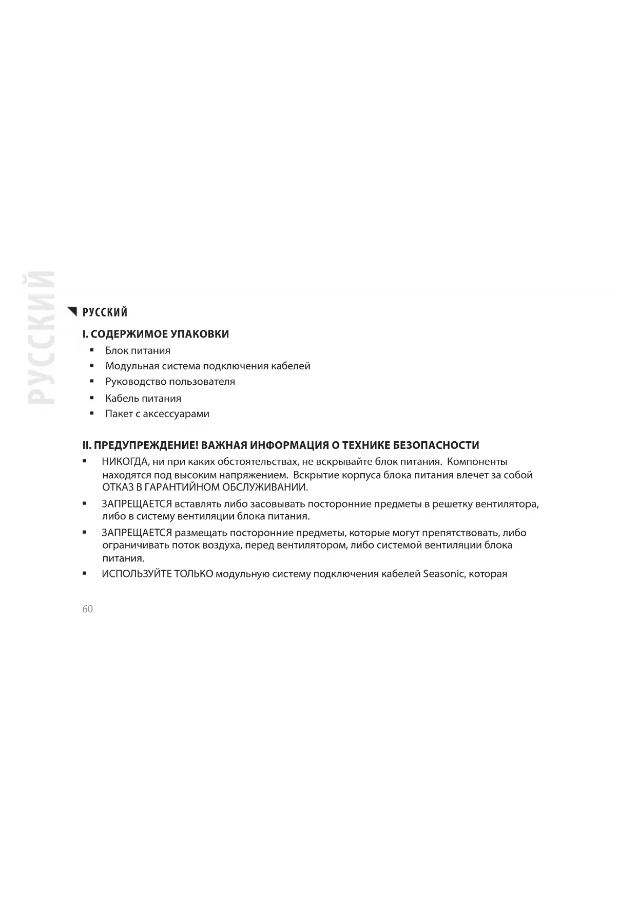Было приложено максимум усилий, чтобы обеспечить точность всей информации, приведенной в данном документе. Sea Sonic не несет явной или подразумеваемой ответственности за любые повреждения компонентов системы или других устройств пользователя в результате ошибки, допущенной при установке или демонтаже блока питания, а также вследствие любого дефекта или неисправности данного продукта. Дополнительные сведения можно найти на веб-сайте www.seasonic.com. РУССКИЙ68