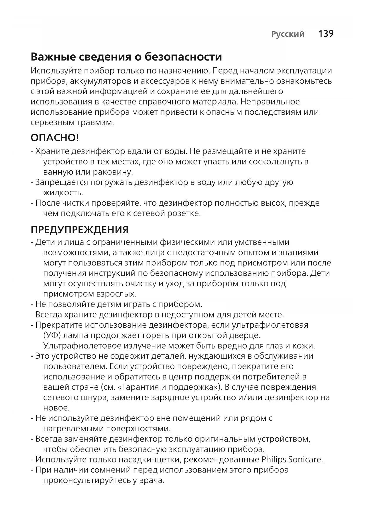 - Не используйте дезинфектор вне помещений или рядом с нагреваемыми поверхностями. - Всегда заменяйте дезинфектор только оригинальным устройством, чтобы обеспечить безопасную эксплуатацию прибора. - Используйте только насадки-щетки, рекомендованные Philips Sonicare. - При наличии сомнений перед использованием этого прибора проконсультируйтесь у врача.140