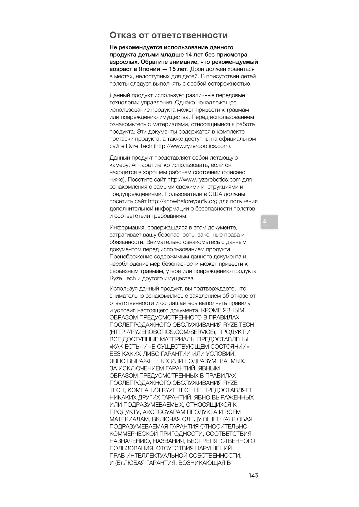 Отказотответственности Не рекомендуется использование данного продукта детьми младше 14 лет без присмотра взрослых. Обратите внимание, что рекомендуемый возраст в Японии — 15 лет. Дрон должен храниться в местах, недоступных для детей. В присутствии детей полеты следует выполнять с особой осторожностью. Данный продукт использует различные передовые технологии управления. Однако ненадлежащее использование продукта может привести к травмам или повреждению имущества. Перед использованием ознакомьтесь с материалами, относящимися к работе продукта. Эти документы содержатся в комплекте поставки продукта, а также доступны на официальном сайте Ryze Tech (http://www.ryzerobotics.com). Данный продукт представляет собой летающую камеру. Аппарат легко использовать, если он находится в хорошем рабочем состоянии (описано ниже). Посетите сайт http://www.ryzerobotics.com для ознакомления с самыми свежими инструкциями и предупреждениями. Пользователи в США должны посетить сайт http://knowbeforeyouy.org для получения дополнительной информации о безопасности полетов и соответствии требованиям. Информация, содержащаяся в этом документе, затрагивает вашу безопасность, законные права и обязанности. Внимательно ознакомьтесь с данным документом перед использованием продукта. Пренебрежение содержимым данного документа и несоблюдение мер безопасности может привести к серьезным травмам, утере или повреждению продукта Ryze Tech и другого имущества. Используя данный продукт, вы подтверждаете, что внимательно ознакомились с заявлением об отказе от ответственности и соглашаетесь выполнять правила и условия настоящего документа. КРОМЕ ЯВНЫМ ОБРАЗОМ ПРЕДУСМОТРЕННОГО В ПРАВИЛАХ ПОСЛЕПРОДАЖНОГО ОБСЛУЖИВАНИЯ RYZE TECH