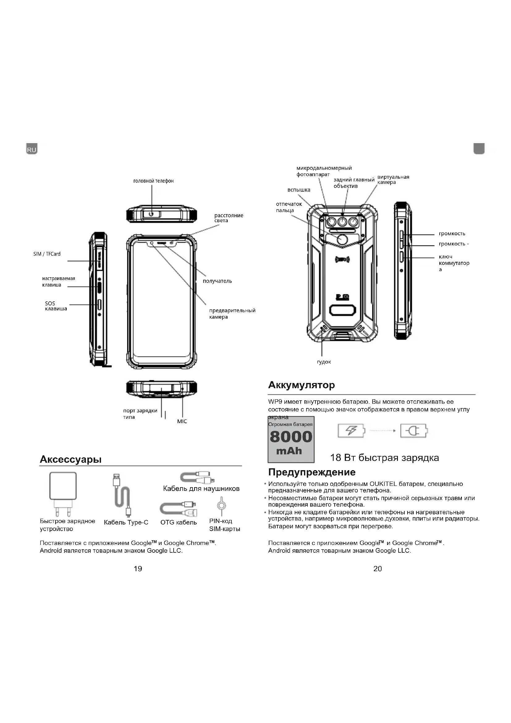 Телефон должен находиться на расстоянии не менее 15 см от любых медицинских имплантат или регулятор ритма и никогда не вставляйте устройство в карман пальто. Если вы столкнулись с ненормальным изображением, например, сбой во время использования, метод обработки следующий: Для мобильного телефона который не может извлечь аккумулятор, нажмите и удерживайте кнопку питания более 12 секунд, мобильный телефон принудительно перезагрузить (разблокировать телефон при перезагрузке) Может решить общую ошибку; для съемного аккумулятора, извлеките аккумулятор, затем вставьте аккумулятор и перезапустите его, чтобы у странить ошибку. Очищайте объектив чистой сухой мягкой тканью. (Пример: объектив камеры) и дисплей. Когда телефоном вы не пользуетесь, отключите его от зарядка.Не подключайте полностью заряженный аккумулятор к зарядному устройству в длительное времея, так как перезарядка сократит срок службы батареи. Стандартная комплектация этой машины (упаковочная коробка - мобильный телефон - инструкция - защитная пленка - кабель для передачи данных USB - зарядное устройство) Не используйте химические растворители или моющие средства для чистки телефона.Протрите чехол телефона мягкой хлопчатобумажной тканью, смоченной вода или мягкое мыло. Избегайте падений, ударов и тряски телефона.обращение с телефоном может привести к разрыву экрана,повреждение внутренней печатной платы и хрупкой конструкции. Пожалуйста, следуйте инструкциям в руководстве, чтобы открыть телефон,разбирайте аксессуары и не пытайтесь использовать другие методы. Тщательно разбирайтесь в обслуживании этого мобильного телефона чтобы пользоваться мобильным телефоном более безопасно и эффективно, а также расширить максимально долгий срок службы мобильного телефона. Не выставляйте устройство вместе с другими батареями. с высокими температурами или тепловыделяющим оборудованием такие как солнечный свет, обогреватели, микроволновые печи, духовки или вода Обогреватели. Перегрев аккумулятора может вызвать взрыв. Когда зарядка завершена или не заряжается, отключите зарядное устройство от устройства и отключите зарядное устройство от розетку. Если устройство оснащено несъемным аккумулятором, не замените аккумулятор самостоятельно, чтобы не повредить аккумулятор или устройство. Использование неутвержденного или несовместимого источника питания, зарядного устройства или аккумулятор может стать причиной пожара, взрыва или других опасностей. Компания не несет ответственности за несчастные случаи. вызвано нестандартным зарядным оборудованием. Если вы хотите прочитать полное соответствие CE, пожалуйста, переходите на эту ссылку: https: //www.oukitel.com Не роняйте, не раздавливайте, не царапайте и не протыкайте аккумулятор, чтобы подвергая аккумулятор чрезмерному внешнему давлению, в результате при внутреннем коротком замыкании и перегреве аккумулятора. Не разбирайте и не сбрасывайте аккумулятор, не вставляйте другие предметы,погрузить в воду или другие жидкости, чтобы избежать протечки батареи,перегрев, пожар или взрыв. RU RU Поставляется с приложением Google