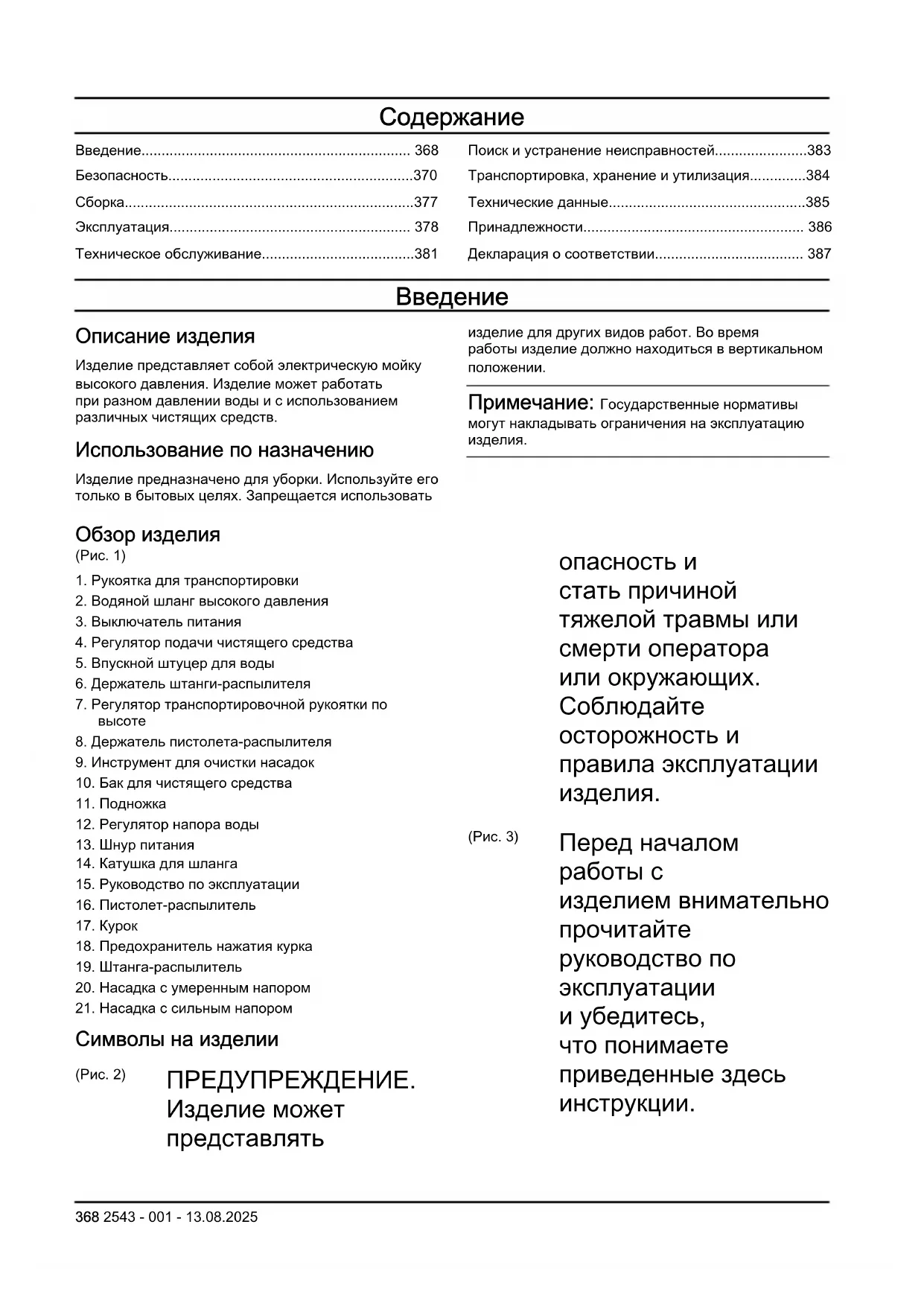 руководство по эксплуатации и убедитесь, что понимаете приведенные здесь инструкции. 368 2543 - 001 - 13.08.2025(Pис. 4)