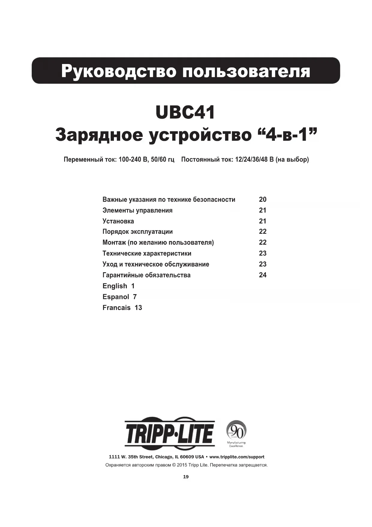 English 1 Espanol 7 Francais 13 1111 W. 35th Street, Chicago, IL 60609 USA • www.tripplite.com/support Охраняется авторским правом © 2015 Tripp Lite. Перепечатка запрещается.20 Важные указания по технике безопасности СОХРАНИТЕ НАСТОЯЩИЕ УКАЗАНИЯ! В настоящем руководстве содержатся важные указания и предупреждения, которые необходимо соблюдать в процессе установки, эксплуатации и хранения всех зарядных устройств Tripp Lite. Предупреждения относительно места установки