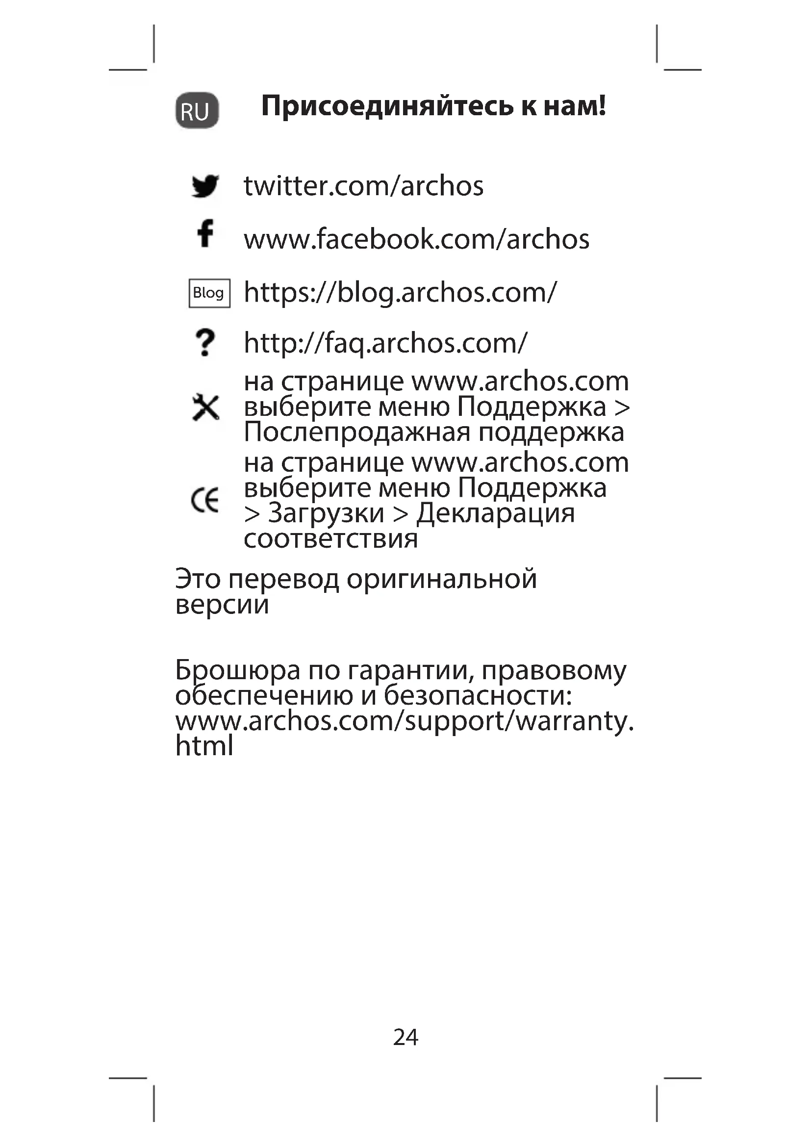 Присоединяйтесь к нам! twitter.com/archos www.facebook.com/archos Blog https://blog.archos.com/ http://faq.archos.com/ на странице www.archos.com выберите меню Поддержка > Послепродажная поддержка на странице www.archos.com выберите меню Поддержка > Загрузки > Декларация соответствия Это перевод оригинальной