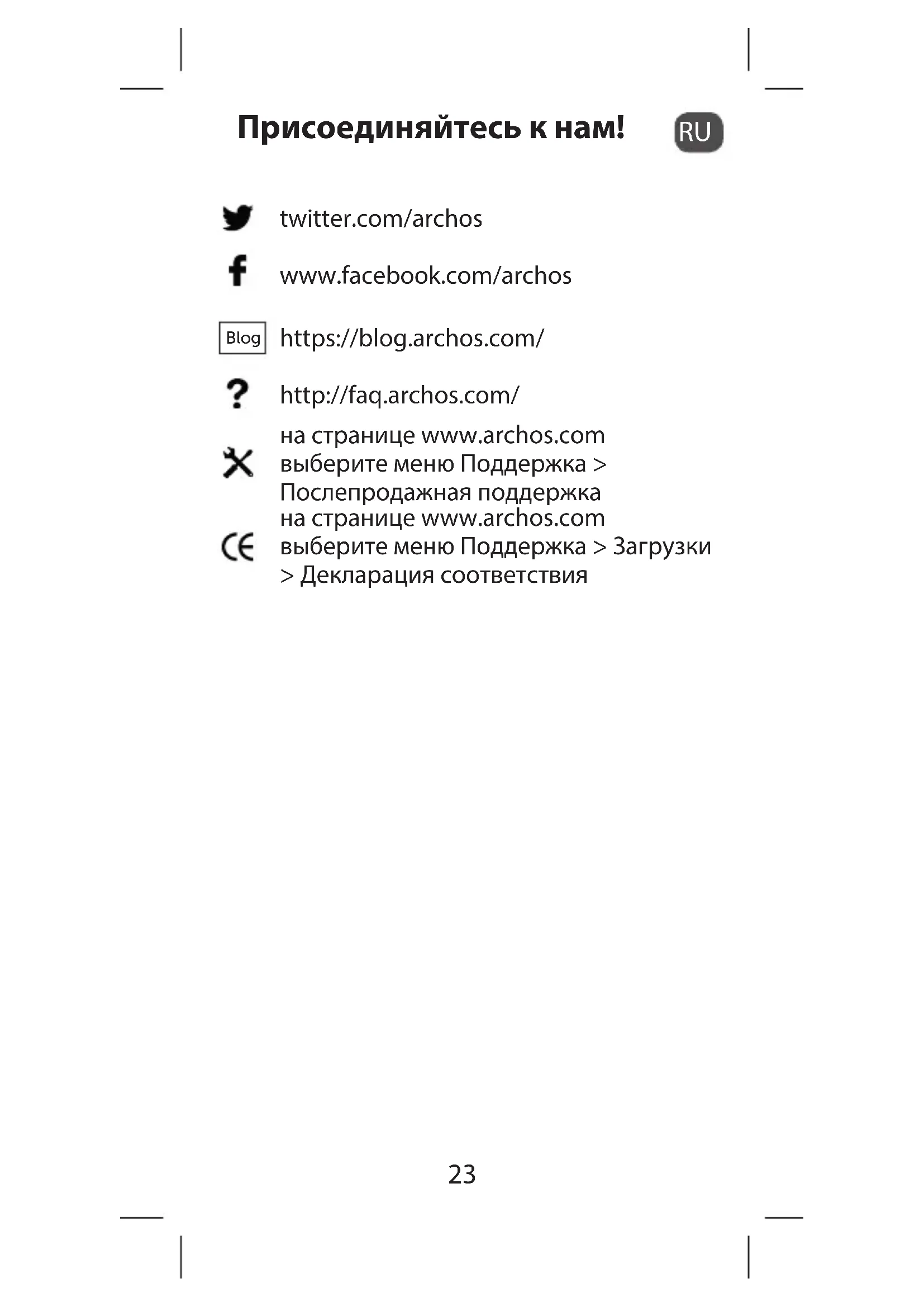 Присоединяйтесь к нам! twitter.com/archos www.facebook.com/archos Blog https://blog.archos.com/ http://faq.archos.com/ на странице www.archos.com выберите меню Поддержка > Послепродажная поддержка на странице www.archos.com выберите меню Поддержка > Загрузки > Декларация соответствия24