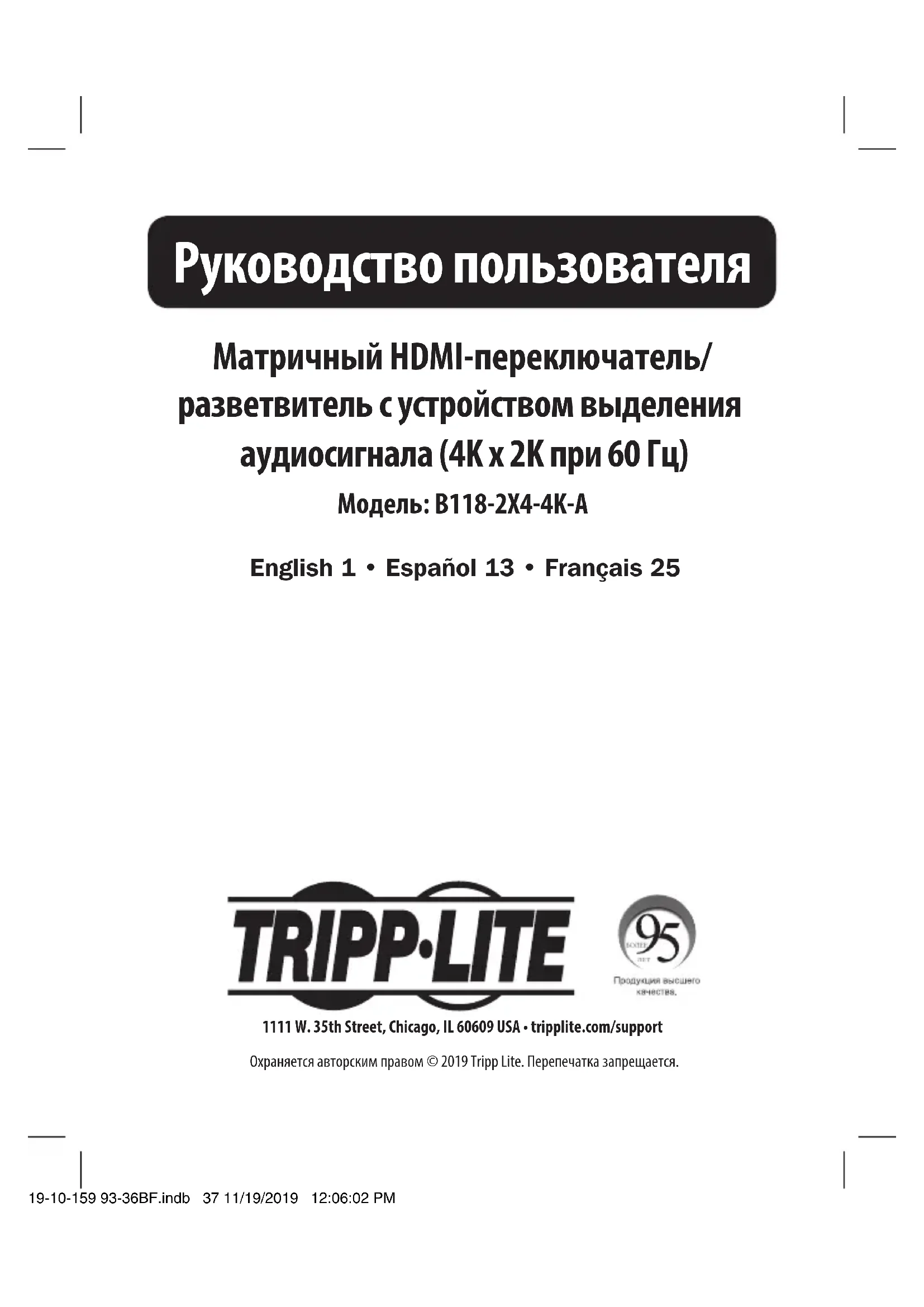 Не рекомендуется использование данного оборудования в системах жизнеобеспечения, где его выход из строя предположительно может привести к перебоям в работе оборудования жизнеобеспечения или в значительной мере снизить его безопасность или эффективность. Компания Tripp Lite постоянно совершенствует свою продукцию. Технические характеристики могут изменяться без предварительного уведомления. Внешний вид реального изделия может несколько отличаться от представленного на фотографиях и иллюстрациях. 1111 W. 35th Street, Chicago, IL 60609 USA • tripplite.com/support 19-10-159 93-3B6F_RevA 19-10-159 93-36BF.indb 48 11/19/2019 12:06:03 PM