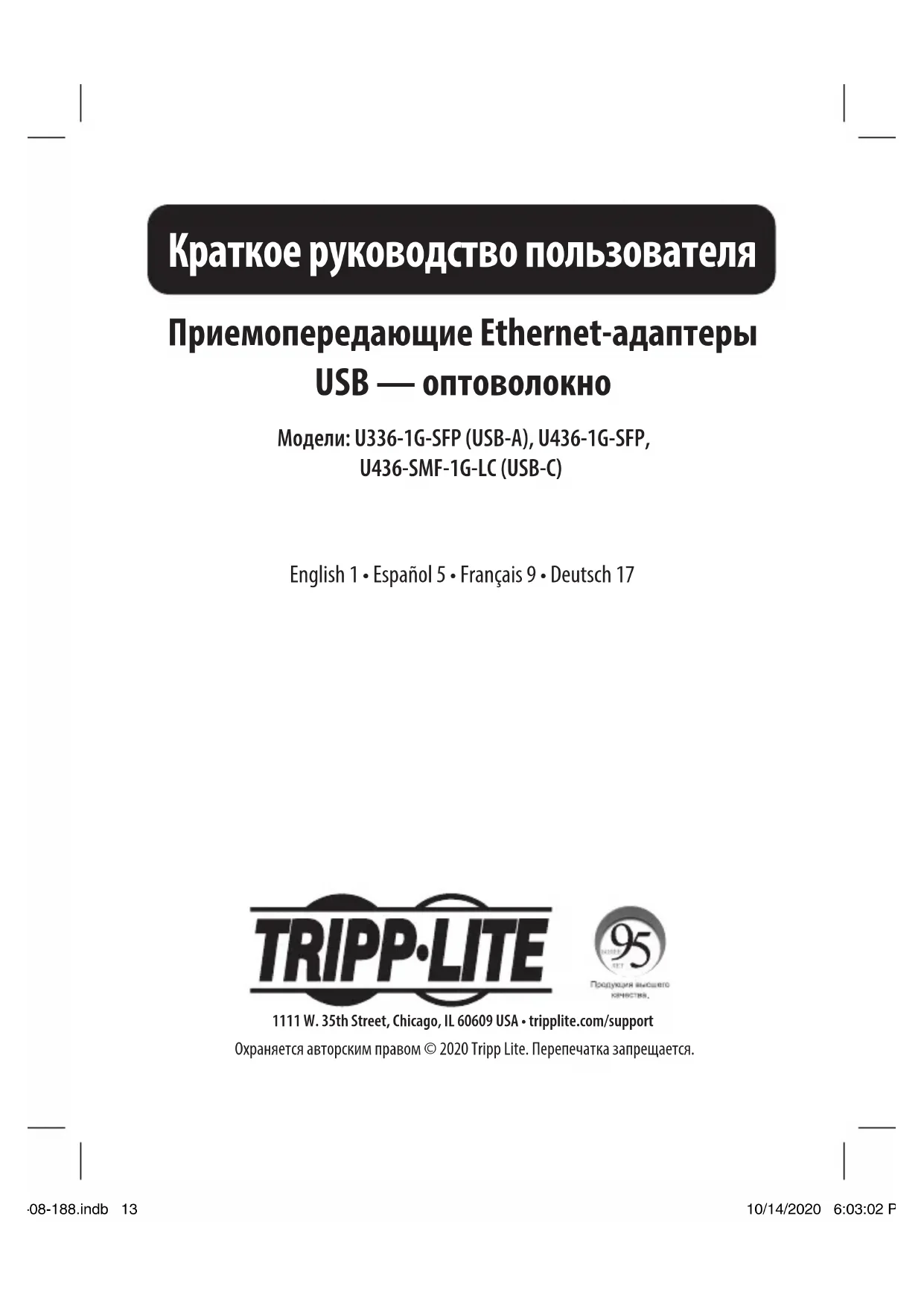 От 0 до 60°C От 0 до 60°C От 0 до 60°C Oтнoсительная влажнoсть От 5 до 90% От 5 до 90% От 5 до 90% Ограниченная гарантия сроком 3 года Компания TRIPP LITE гарантирует отсутствие дефектов материалов и изготовления в течение трех (3) лет с момента первоначальной покупки. Oбязательства компании TRIPP LITE по настоящей гарантии ограничиваются ремонтом или заменой (по ее единоличному усмотрению) любых таких дефектных изделий. Для получения услуг по данной гарантии необходимо получить номер Returned Material Authorization (RМА — разрешение на возврат материалов) от компании TRIPP LITЕ или ее авторизованного сервисного центра. Изделия должны быть возвращены в компанию TRIPP LITE или авторизованный сервисный центр TRIPP LITE с предоплатой транспортных расходов и сопровождаться кратким описанием возникшей проблемы и документом, подтверждающим дату и место его приобретения. Действие настоящей гарантии не распространяется на оборудование, поврежденное в результате аварии, небрежного обращения или неправильного использования, а также видоизмененное каким бы то ни было образом. ЗА ИСКЛЮЧЕНИЕМ ПРЕДУСМОТРЕННЫХ ЗДЕСЬ СЛУЧАЕВ КОМПАНИЯ TRIPP LITE НЕ ПРЕДОСТАВЛЯЕТ КАКИХ-ЛИБО ЯВНЫХ ИЛИ ПОДРАЗУМЕВАЕМЫХ ГАРАНТИЙ, ВКЛЮЧАЯ ГАРАНТИИ КОММЕРЧЕСКОЙ ПРИГОДНОСТИ И ПРИГОДНОСТИ ДЛЯ КАКОЙ-ЛИБО КОНКРЕТНОЙ ЦЕЛИ. B нeкоторых штатах/государствах ограничениe или исключение подразумеваемых гарантий не допускается; следоватeльно, вышеуказанное(-ые) ограничение(-я) или иcключение(-я) могут не распространяться на покупатeля. ЗА ИСКЛЮЧЕНИЕМ ПРЕДУСМОТРЕННЫХ ВЫШЕ СЛУЧАЕВ КОМПАНИЯ TRIPP LITЕ НИ ПРИ КАКИХ ОБСТОЯТЕЛЬСТВАХ НЕ НЕСЕТ ОТВЕТСТВЕННОСТИ ЗА ПРЯМЫЕ, КОСВЕННЫЕ, CЛУЧАЙНЫЕ ИЛИ ПОБОЧНЫЕ УБЫТКИ ЛИБО УБЫТКИ, ОПРЕДЕЛЯЕМЫЕ ОСОБЫМИ ОБCТОЯТЕЛЬСТВАМИ, ВОЗНИКАЮЩИЕ В СВЯЗИ С ИСПОЛЬЗОВАНИЕМ ДАННОГО ИЗДЕЛИЯ, ДАЖЕ В CЛУЧАЕ ЕЕ ИНФОРМИРОВАНИЯ О ВОЗМОЖНОCТИ НАСТУПЛЕНИЯ ТАКИХ УБЫТКОВ. В частности, компания TRIPP LITE не несет ответственности за какие-либо издержки, такие как упущенные прибыли или доходы, потеря оборудования, потеря возможности использования оборудования, потеря программного обеспечения, потеря данных, расходы на заменители, урегулирование претензий третьих лиц и пр. 20-08-188.indb 1620-08-188.indb 16 10/14/2020 6:03:03 PM10/14/2020 6:03:03 PM17 USB-auf-Glasfaser-Transceiver- Ethernet-Adapter Modelle: U336-1G-SFP (USB-A), U436-1G-SFP, U436-SMF-1G-LC (USB-C) 1111 W. 35th Street, Chicago, IL 60609 USA • tripplite.com/support Copyright © 2020 Tripp Lite. Alle Rechte vorbehalten. Kurzanleitung English 1 • Español 5 • Français 9 • Русский 13 20-08-188.indb 1720-08-188.indb 17 10/14/2020 6:03:03 PM10/14/2020 6:03:03 PM18 U336-1G-SFP: